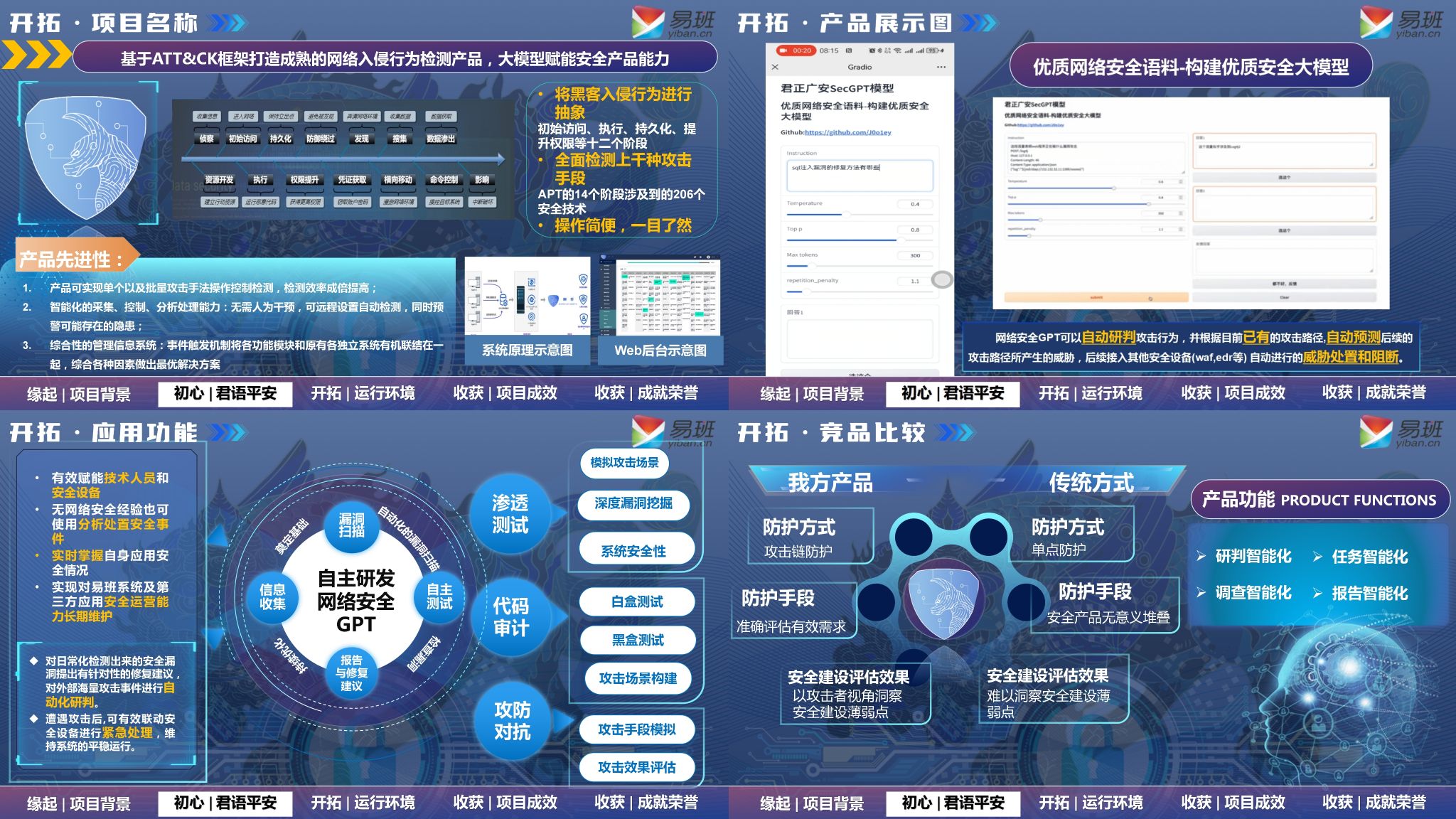 “自主研發(fā)獎(jiǎng)”獲獎(jiǎng)作品《君語平安—基于大語言模型的易班網(wǎng)絡(luò)安全智能防御系統(tǒng)》,通過將基于大語言模型自主研發(fā)的“獬豸”網(wǎng)絡(luò)入侵行為智能檢測平臺(tái),與網(wǎng)絡(luò)安全GPT深度結(jié)合,為易班平臺(tái)提供實(shí)時(shí)的安全檢測,為廣大易班用戶的安全保駕護(hù)航。