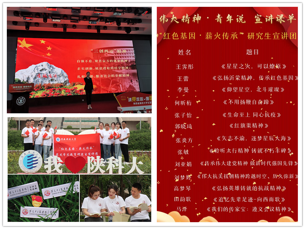 宣講隊伍中既有理論功底深厚、宣講經(jīng)驗豐富的專家教授,也有緊跟前沿、深耕專業(yè)的青年博士,還有朝氣蓬勃、思維活躍的研究生;3人入選黨的二十大精神“馬克思主義學(xué)院院長宣講團(tuán)”、陜西省高校黨的創(chuàng)新理論宣講團(tuán)、首批陜西省“新時代文明實踐宣講師”,5人入選未央?yún)^(qū)黨校干部教育培訓(xùn)師資庫。研究生宣講團(tuán)入選“陜西高校青年愛國奮斗宣講聯(lián)盟”成員單位,團(tuán)隊或個人榮獲陜西大學(xué)生“青春向黨”黨史學(xué)習(xí)教育微宣講“優(yōu)秀組織單位”,生態(tài)環(huán)境部“清潔美麗中國行”全國高校小額資助項目“三等獎”,全省高校大學(xué)生宣講比賽“特等獎”,“這十年·青年講”全國高校宣講聯(lián)賽西北賽區(qū)二等獎2項、三等獎1項,校級“優(yōu)秀黨支部”“優(yōu)秀黨員標(biāo)兵”“十佳大學(xué)生社團(tuán)”等榮譽(yù)。