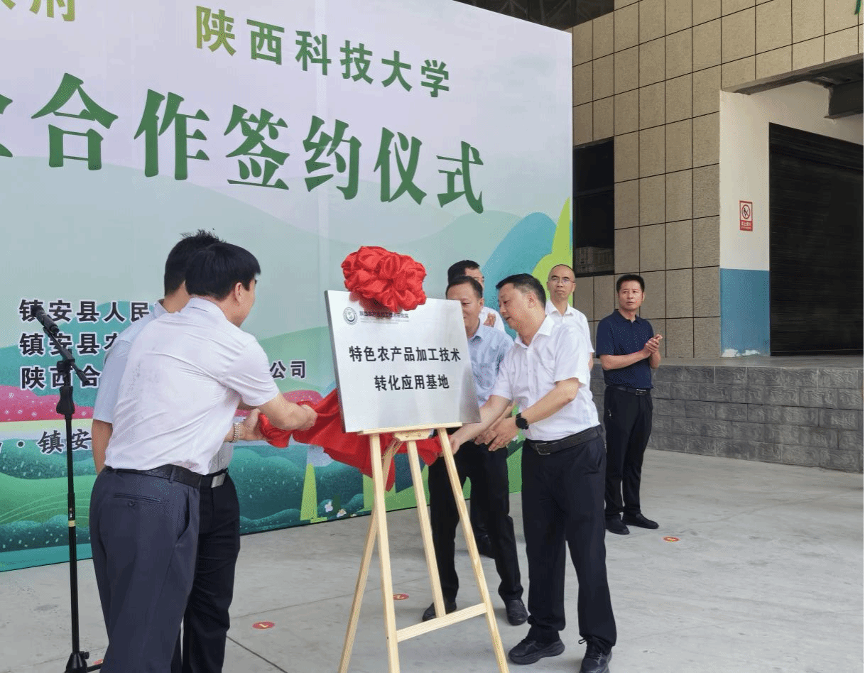 黃劍鋒、閆丹彬、楊超剛、鄧遠(yuǎn)輝共同為特色農(nóng)產(chǎn)品加工技術(shù)轉(zhuǎn)化應(yīng)用基地揭牌。
