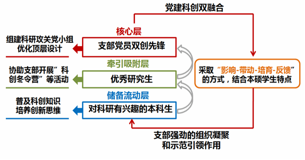 立育人之本,創(chuàng)新“雙電層”組織凝聚體系。從材料專業(yè)出發(fā),創(chuàng)造性引入學生創(chuàng)新實踐“雙電層”組織凝聚體系的概念,將支部作為正離子,學生作為負離子,形成以支部雙創(chuàng)先鋒為核心吸引,研究生為吸附層牽引,本科生為流動層儲備的雙電層組織凝聚體系。通過“科創(chuàng)冬令營”等品牌活動,既實現(xiàn)碩一本分類指導,又形成吸附層和流動層向核心梯度遞進的運行模式。