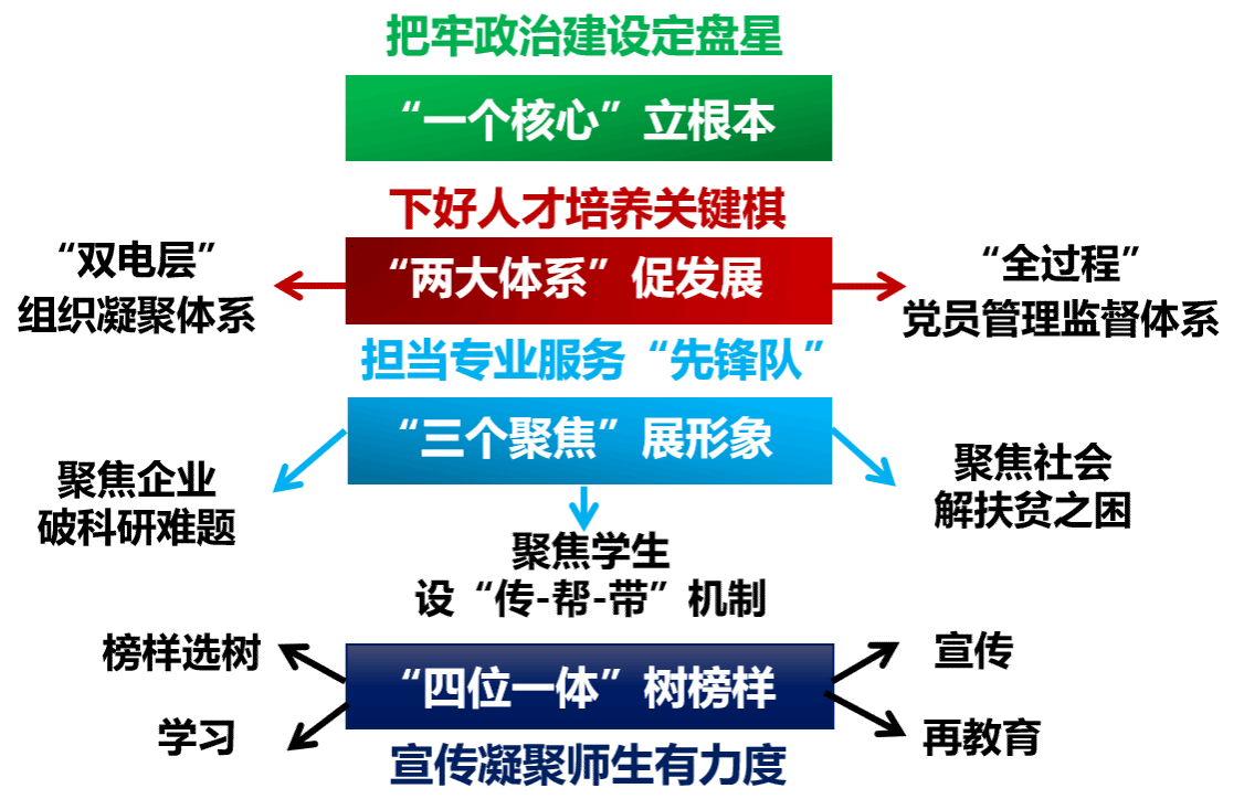 支部建設的關鍵在于:抓實黨建融入研究生教育提高質量、追求卓越這一中心任務,聚學科之力、育時代新人。支部在管理組織方面設立了符合支部實際情況的工作引導體系——兩體系,促進基層黨組織戰(zhàn)斗力提升切實做到管理黨員有力、組織黨員有序。