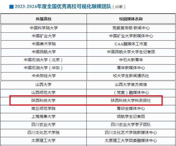 近日,由中國青年報社、中青校媒主辦的“2023-2024尋找高??梢暬诿綀F隊”評選活動結(jié)果揭曉,陜西科技大學科奕報社榮獲“2023-2024年度全國優(yōu)秀高??梢暬诿綀F隊”稱號(全國60家)。