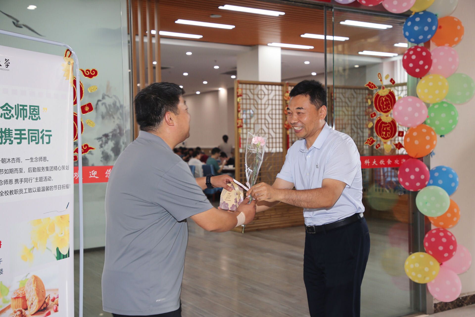 在這個(gè)金秋送爽、碩果累累的季節(jié)里,我們迎來(lái)了第40個(gè)教師節(jié)。為表達(dá)對(duì)全校教師辛勤耕耘、無(wú)私奉獻(xiàn)的崇高敬意和深深感激,學(xué)校后勤集團(tuán)飲食服務(wù)中心精心準(zhǔn)備了500枝康乃馨、500塊月餅,于9月10日在學(xué)校馨園餐廳門口開展“以花傳情,感恩師恩”教師節(jié)獻(xiàn)花活動(dòng)。