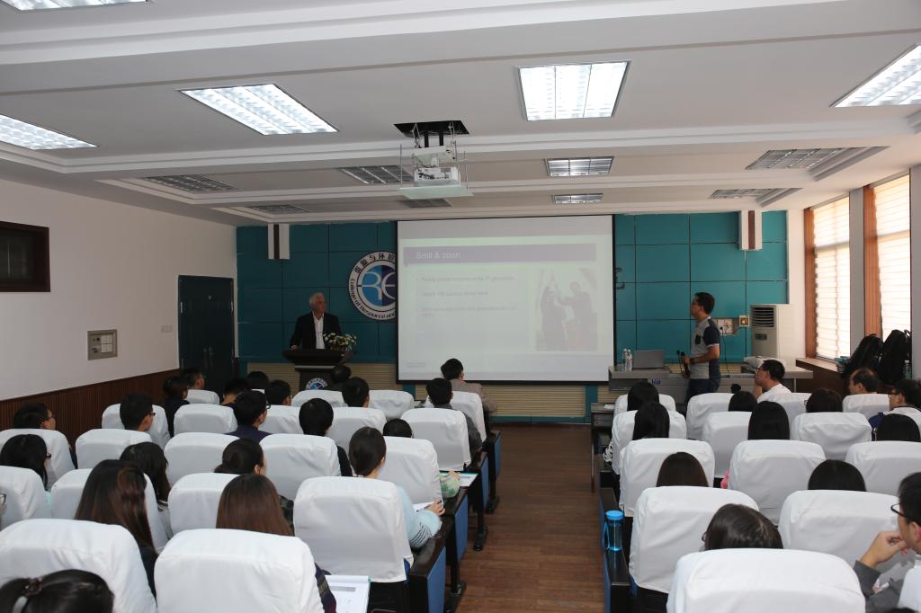 Matthias Scholl從斯密特(SMIT&ZOON)公司皮革行業(yè)的可持續(xù)發(fā)展戰(zhàn)略、毛革清潔環(huán)保工藝、皮革化工材料的未來(lái)發(fā)展趨勢(shì)三大方面展開(kāi)闡述。他首先從工業(yè)、污水中鉻含量、皮革中固定的鉻含量等方面對(duì)傳統(tǒng)鉻鞣劑制革技術(shù)和DF清潔安全技術(shù)做了詳細(xì)比較,得出DF清潔鞣制工藝不僅增加了皮革成品中鉻的固定含量、大大降低了廢水中鉻離子和氯離子的含量,減少了環(huán)境污染,而且該清潔鞣制工藝免除了浸酸和提堿步驟,在一定程度上降低了成本,進(jìn)而實(shí)現(xiàn)了經(jīng)濟(jì)和生態(tài)平衡的可持續(xù)發(fā)展。其次,加脂劑的選擇是該技術(shù)成功的關(guān)鍵,因此Matthias Scholl對(duì)該鞣制工藝中使用的加脂劑的基礎(chǔ)研究及應(yīng)用性能進(jìn)行了深入分析,與現(xiàn)場(chǎng)師生就清潔制革工藝頻頻互動(dòng),并詳細(xì)解答了師生的問(wèn)題,最后,Matthias Scholl重申史密特(SMIT&ZOON)公司未來(lái)的重心是關(guān)愛(ài)人類安全與健康、保持經(jīng)濟(jì)持續(xù)發(fā)展和維護(hù)地球生態(tài)與環(huán)保,創(chuàng)建人類、地球與經(jīng)濟(jì)三方共同發(fā)展的新局面,并希望與我校就有關(guān)領(lǐng)域進(jìn)行更深入的學(xué)術(shù)合作交流。