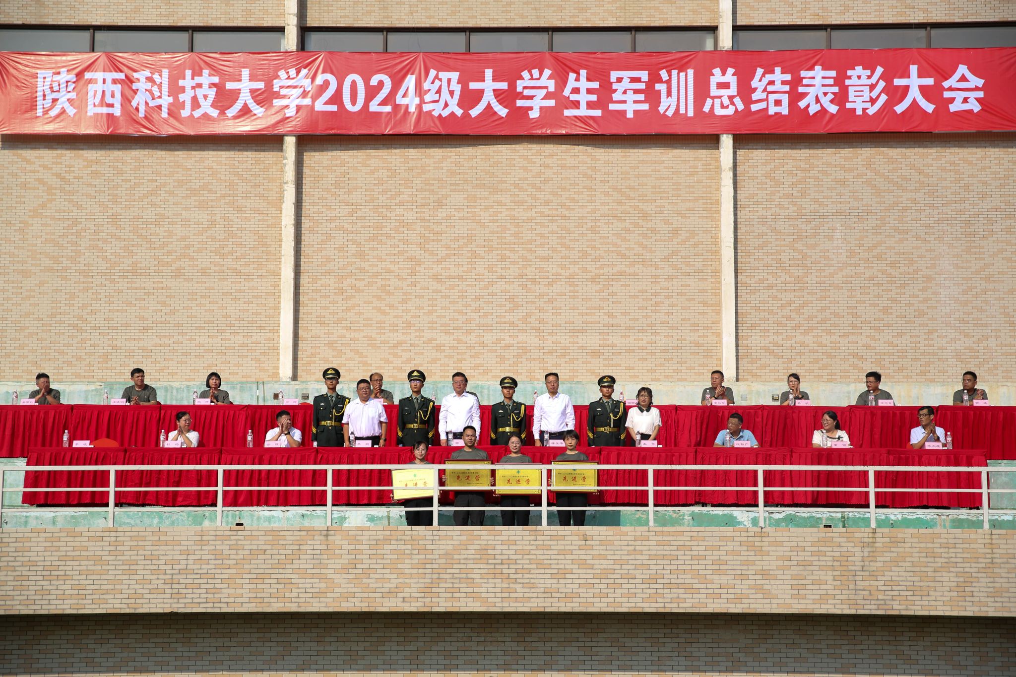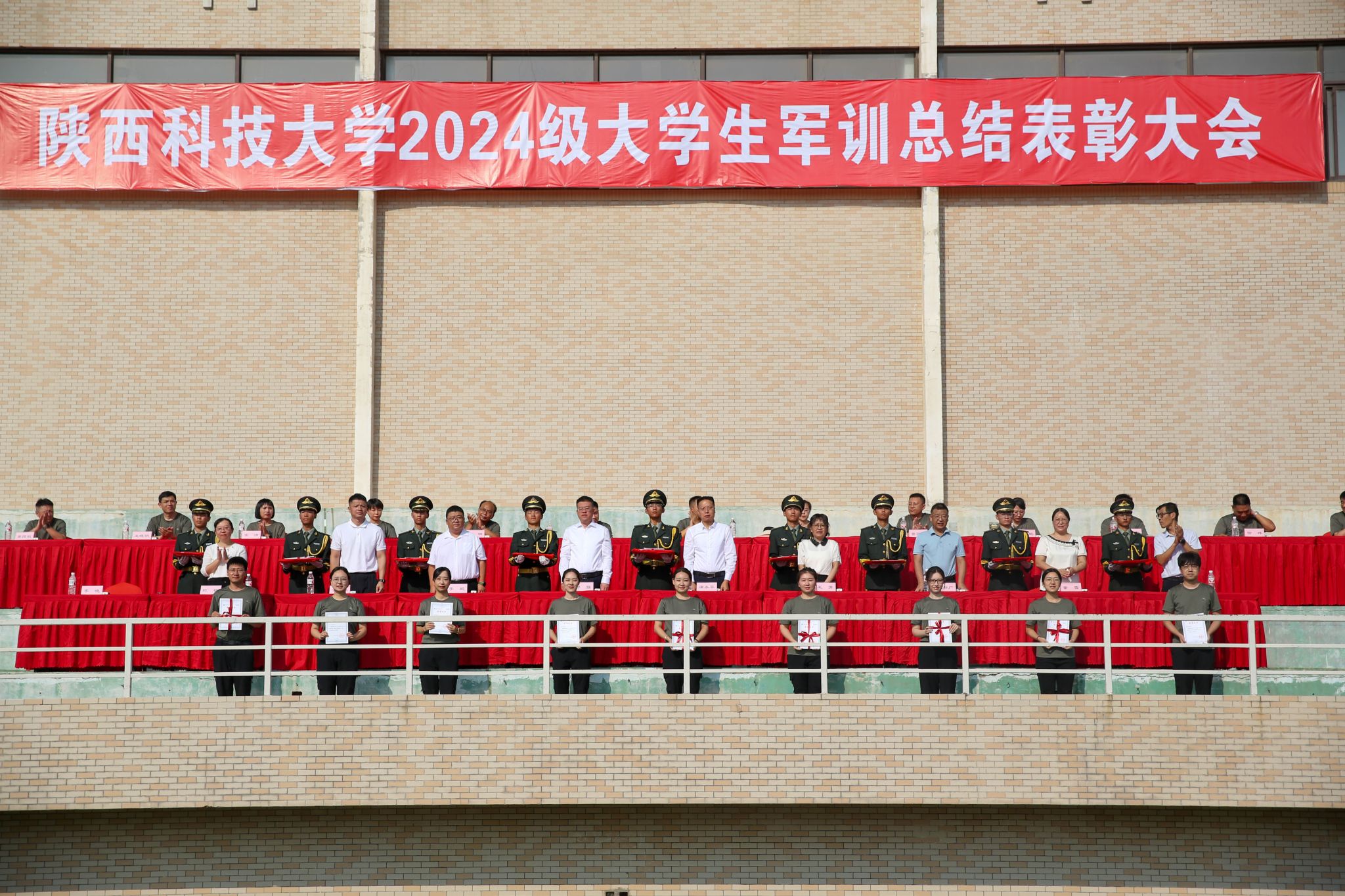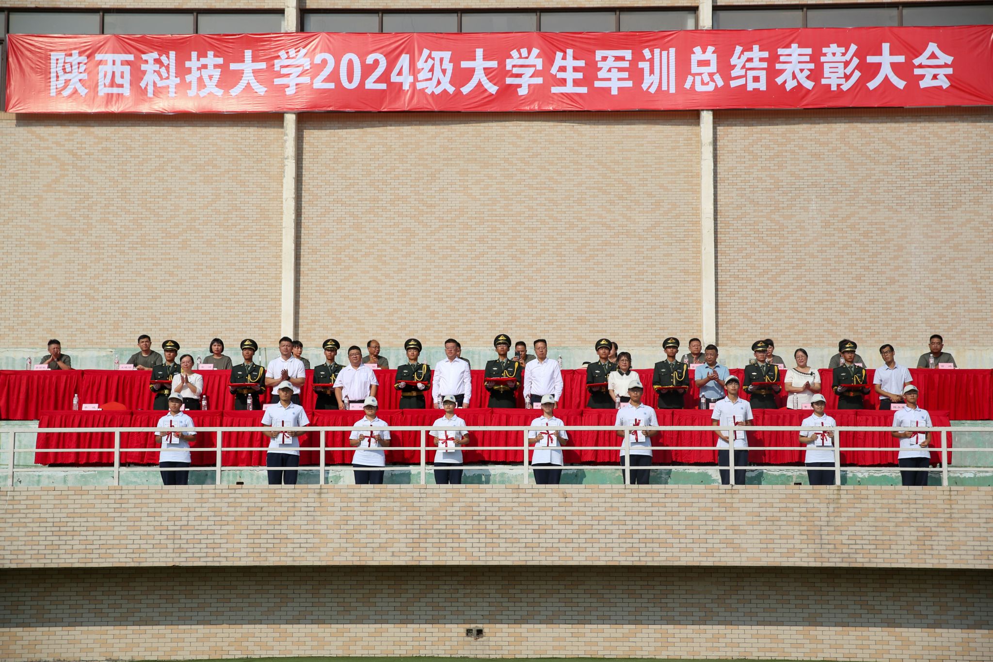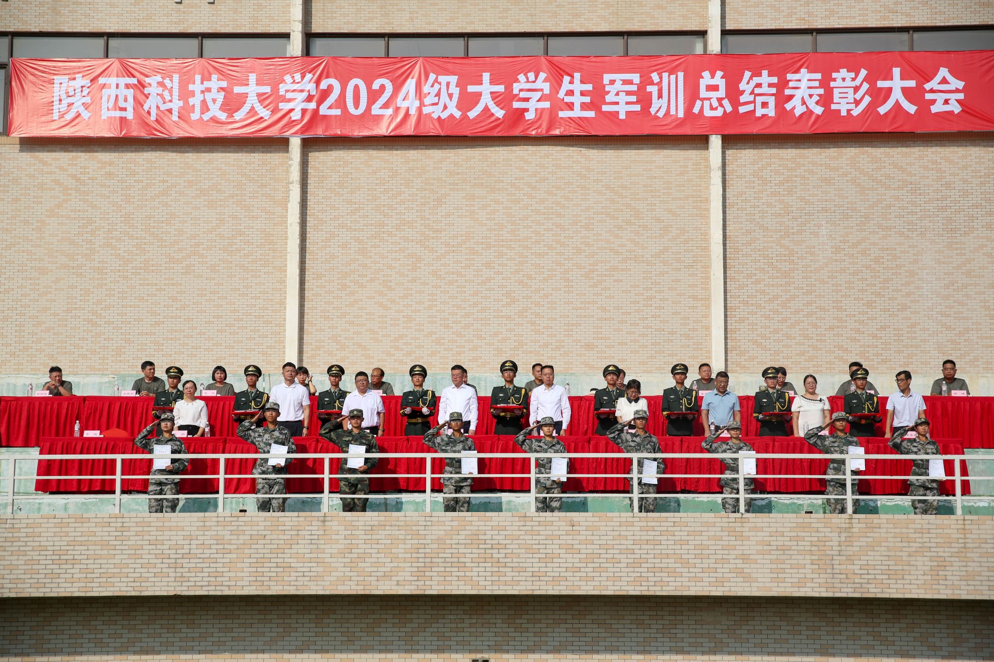 9月13日上午,我校2024級大學(xué)生軍事訓(xùn)練總結(jié)表彰大會在標(biāo)準(zhǔn)田徑場舉行。校黨委副書記郭強、副校長蒲永平及軍訓(xùn)團各部門負(fù)責(zé)人、各營教導(dǎo)員參加大會。大會由學(xué)工部(武裝部)部長李曉主持。