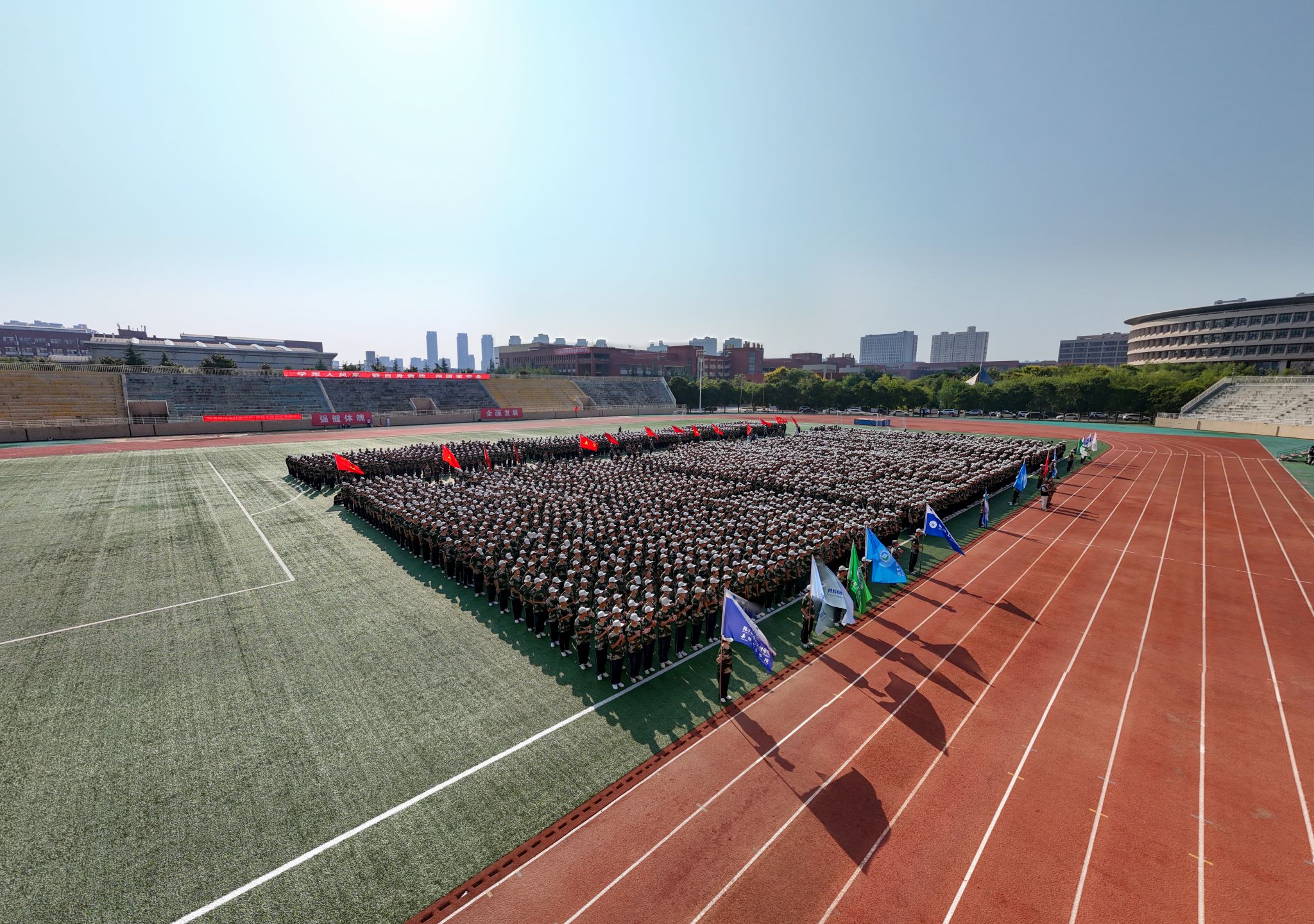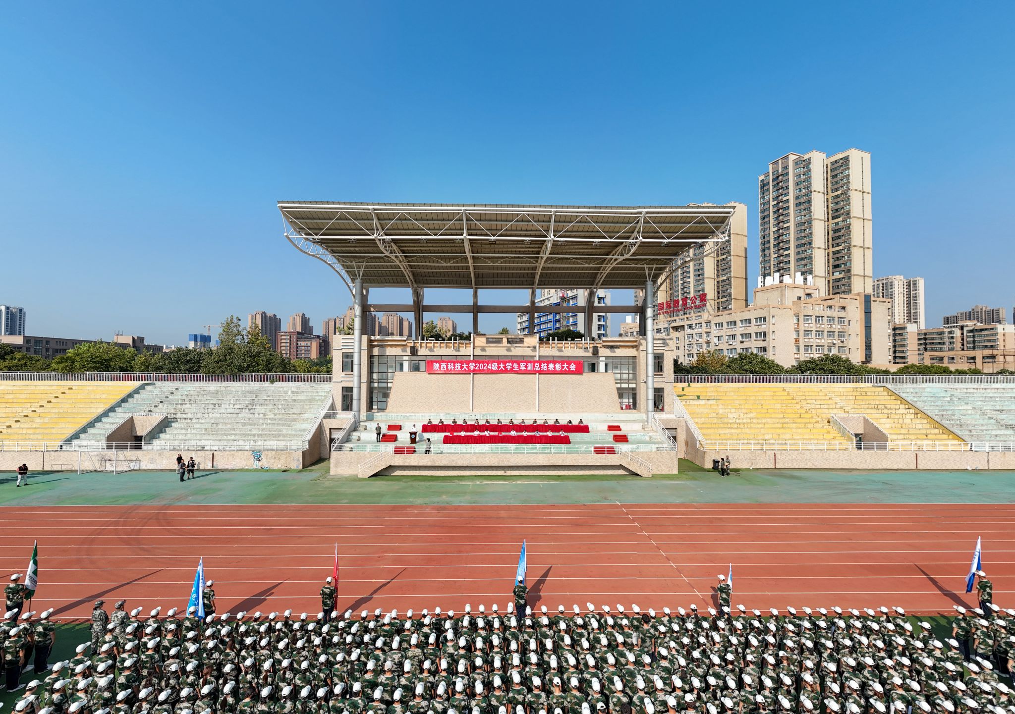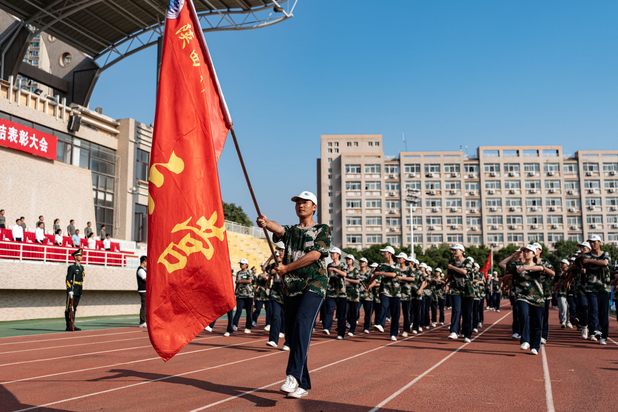 軍訓(xùn)工作成果以分列式形式展現(xiàn)。嚴(yán)整的軍容、威武的軍姿、嘹亮的口號、整齊的隊列、雄壯的氣勢,無不展現(xiàn)了新一代陜科大學(xué)子自強自信、團結(jié)拼搏的精神風(fēng)貌。