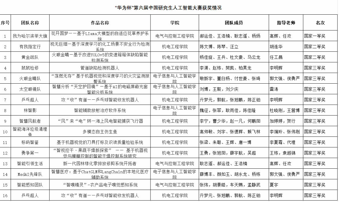 9月24日至27日,“華為杯”第六屆中國(guó)研究生人工智能創(chuàng)新大賽全國(guó)總決賽在哈爾濱華旗飯店國(guó)際會(huì)議中心舉行。經(jīng)過(guò)答辯和評(píng)審,我校研究生團(tuán)隊(duì)獲國(guó)家一等獎(jiǎng)1項(xiàng),二等獎(jiǎng)2項(xiàng)、三等獎(jiǎng)13項(xiàng),同時(shí),我校獲“優(yōu)秀組織獎(jiǎng)”。