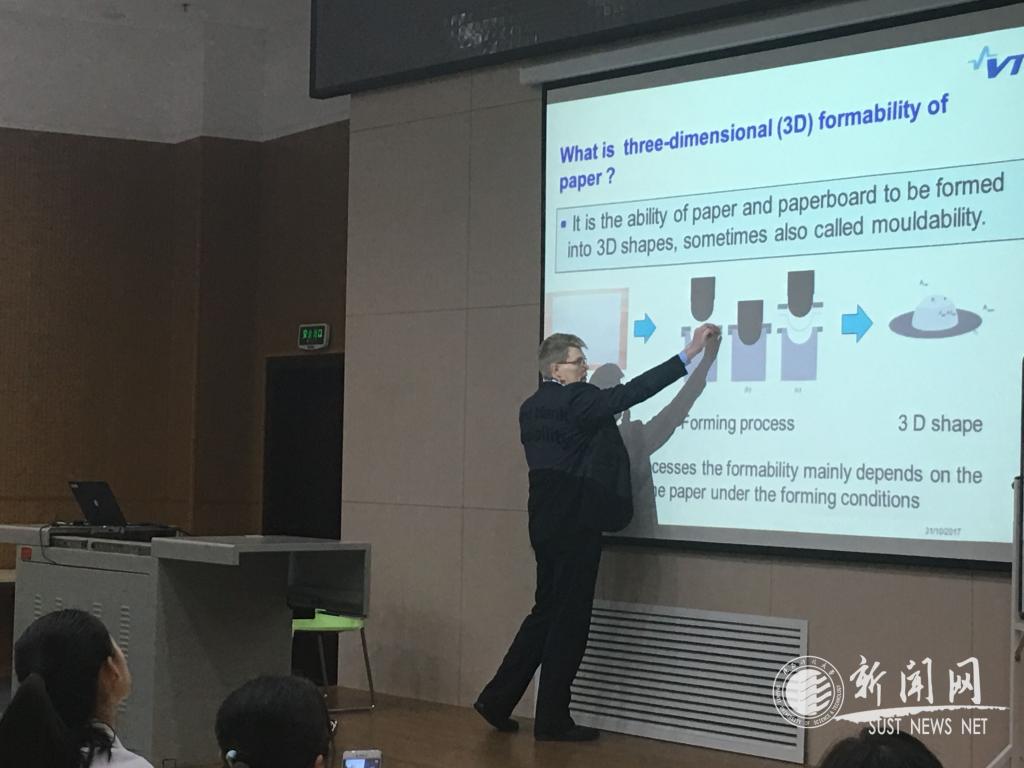 Elias教授做了制漿造紙相關(guān)領(lǐng)域的系列專題報(bào)告“Three-dimensional formability of paper”和“Tool for evaluation of the quality of recycled fiber material”。系統(tǒng)講述了國外造紙企業(yè)、研究院等在纖維素包裝材料制品領(lǐng)域的研究探索,重點(diǎn)介紹了在包裝材料制作工藝、技術(shù)層面的創(chuàng)新實(shí)例,及在補(bǔ)充石油基包裝材料缺陷方面的優(yōu)勢(shì),為纖維包裝材料的應(yīng)用提供理論依據(jù)。報(bào)告中清晰的研究思路、創(chuàng)新的實(shí)驗(yàn)設(shè)想和嚴(yán)謹(jǐn)?shù)臄?shù)據(jù)分析,對(duì)啟發(fā)和提高我院師生的科研思路和水平很有幫助,拓寬了學(xué)生的知識(shí)與眼界,師生們積極地參與了后續(xù)的答疑解惑環(huán)節(jié),Elias教授認(rèn)真聽取了各種問題并且悉心做出解答。