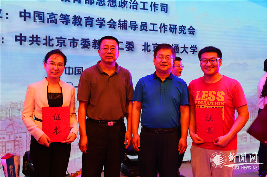 省委高教工委副書記李智軍(圖右二)、校黨委副書記溫鋒(圖左二)與獲獎(jiǎng)輔導(dǎo)員王雪婧、張欽峰合影