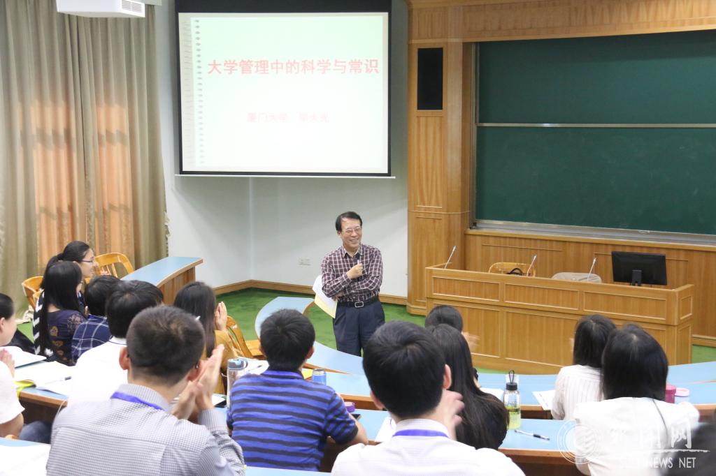 長江學者、杰出青年基金獲得者、廈門大學材料學院鄭南峰教授在《青年學者如何邁好科研步伐》中,將科學研究的方法進行了高度凝練與概括,他自身卓越的科研經歷與成就給予青年教師們極大的鼓勵;廈門大學生命科學學院特聘教授袁晶的講座題目為《青年學者對話:國內外科研經驗交流》,他結合自己在美國著名的NIH實驗室的博士后學習經歷,對比了國內外科研環(huán)境機制,并與大家分享了科研團隊管理、學術論文寫作以及科研與生活平衡等感悟;入選教育部新世紀優(yōu)秀人才計劃、廈門大學材料學院“閩江學者”特聘教授李磊主講《國家自然科學基金申請及申請書寫作》專題,他為在座青年教師講解了獲取研究前沿最新動態(tài)的方法以及申報國家自然科學基金的細節(jié)、技巧及注意事項;央視《百家講壇》欄目主講人、廈門大學管理學院教授傅小凡的講座題目為《傳統(tǒng)文化中的管理思想》,他妙語連珠,以先秦儒家為例,對孔子、孟子、荀子三位思想家的管理思想做出精彩解讀。