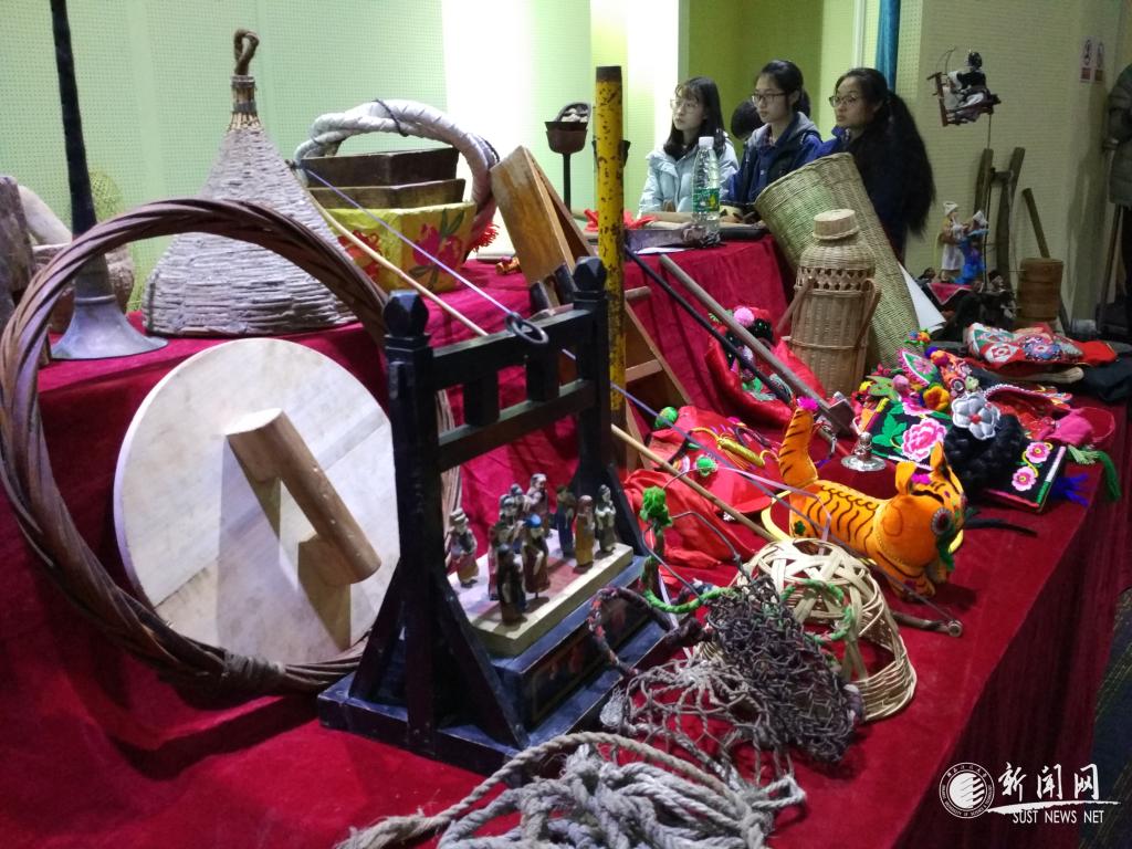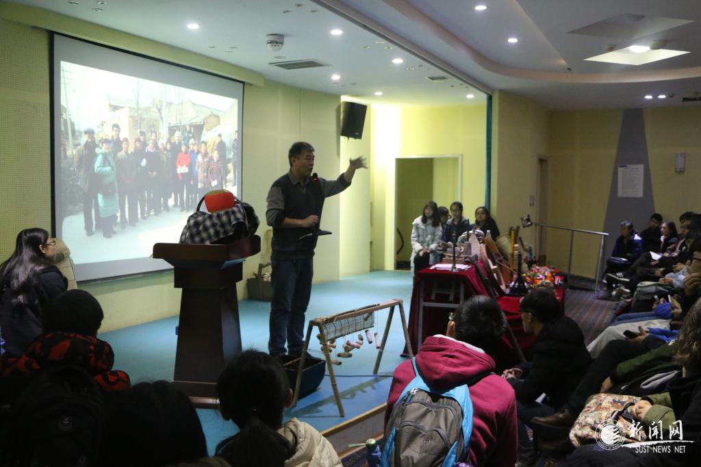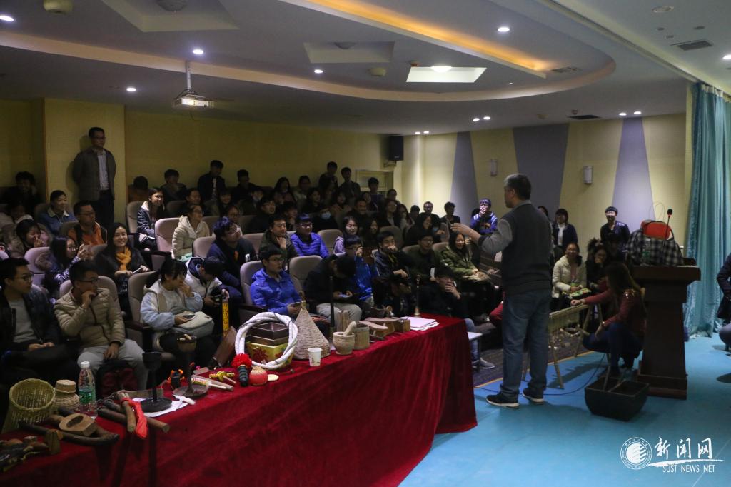 主講人王智老師系陜西省民間文藝家協(xié)會副主席,西安市非物質(zhì)文化遺產(chǎn)保護中心副主任,多年來一直從事非物質(zhì)文化遺產(chǎn)田野調(diào)查,被人民日報譽為“陜西非物質(zhì)文化遺產(chǎn)搜索引擎”。他首先為大家講解了非物質(zhì)文化遺產(chǎn)的概念、特點和種類,闡釋了保護非物質(zhì)文化遺產(chǎn)的價值和意義。然后結(jié)合實物為大家深入淺出的分享了自己與非遺背后的故事,闡釋了一件件非遺作品深層的文化內(nèi)涵,現(xiàn)場的師生們不僅聽的入迷也與王老師不斷互動,走上講臺親自感受竹席編織技藝,背上背夾感受山區(qū)人民的艱辛。本次報告,他為學(xué)生帶來了大量的陜西非物質(zhì)文化遺產(chǎn)實物作品,有剪紙作品、虎頭帽、斗、木桿秤、嗩吶等,給在場師生更為直觀的感受。