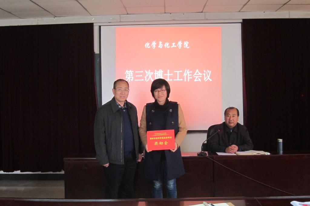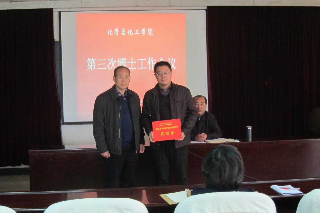 會上,化工學(xué)院對2015年國家自然科學(xué)基金獲得者楊冬、費(fèi)貴強(qiáng)進(jìn)行了表彰并頒發(fā)獎(jiǎng)金,并號召全院科研人才以他們?yōu)榘駱?,努力提升科研能力,多申?bào)科研立項(xiàng),轉(zhuǎn)化科研成果,不遺余力做好化學(xué)工程與技術(shù)一級學(xué)科建設(shè)。