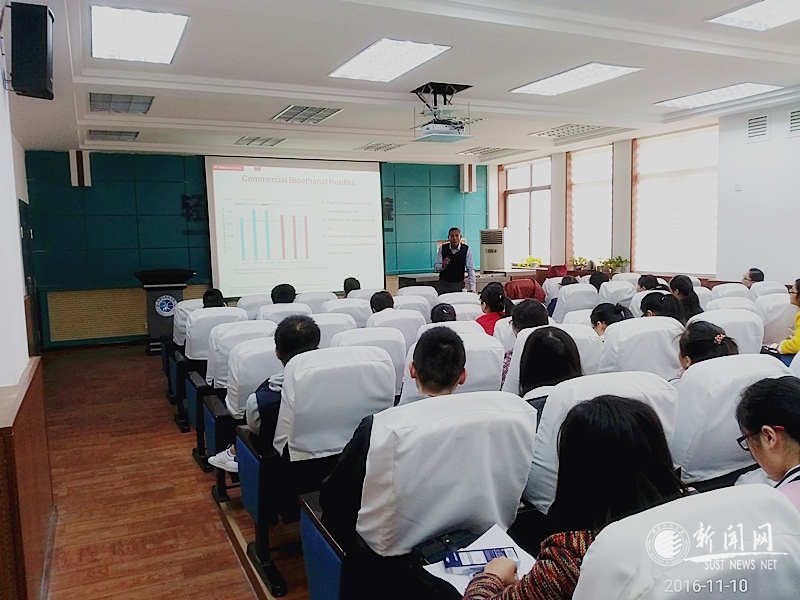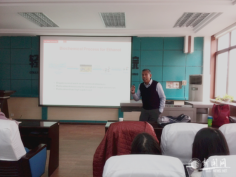 實(shí)驗(yàn)樓1B318他為在座學(xué)生作了題為“高溫預(yù)水解結(jié)合機(jī)械磨漿用于木質(zhì)纖維及木素生產(chǎn)高值化產(chǎn)品”的學(xué)術(shù)報(bào)告。本場報(bào)告會(huì)由輕工科學(xué)與工程學(xué)院副院長張素風(fēng)教授主持,為我?!皩?dǎo)師論壇”系列學(xué)術(shù)報(bào)告。報(bào)告中,漢森·嘉米爾(Hasan Jameel)教授首先介紹了生物質(zhì)精煉的內(nèi)涵、發(fā)展及前景,主要從燃料乙醇與生物柴油轉(zhuǎn)化,琥珀酸、糠醛、羥甲基糠醛等高附加值化學(xué)品轉(zhuǎn)化,以及木素基膠黏劑與泡沫材料等方面進(jìn)行了詳細(xì)闡述。他重點(diǎn)講述了高溫預(yù)水解結(jié)合機(jī)械法磨漿預(yù)處理在生物質(zhì)精煉中的重要性與優(yōu)勢(shì),其優(yōu)勢(shì)在于綠色環(huán)保性、低成本、弱腐蝕性、與酸預(yù)處理相比具有較少的降解產(chǎn)物、無硫殘余物(木素),有利于高附加值產(chǎn)品轉(zhuǎn)化等。隨后他又闡述了由于成本較高導(dǎo)致木質(zhì)纖維素轉(zhuǎn)化乙醇此路線受制約的問題,因此未來需要將預(yù)處理后所得木聚糖、纖維素、木素等進(jìn)行分離分級(jí),進(jìn)而轉(zhuǎn)化為不同化學(xué)品材料,如木材膠黏劑、泡沫材料等。