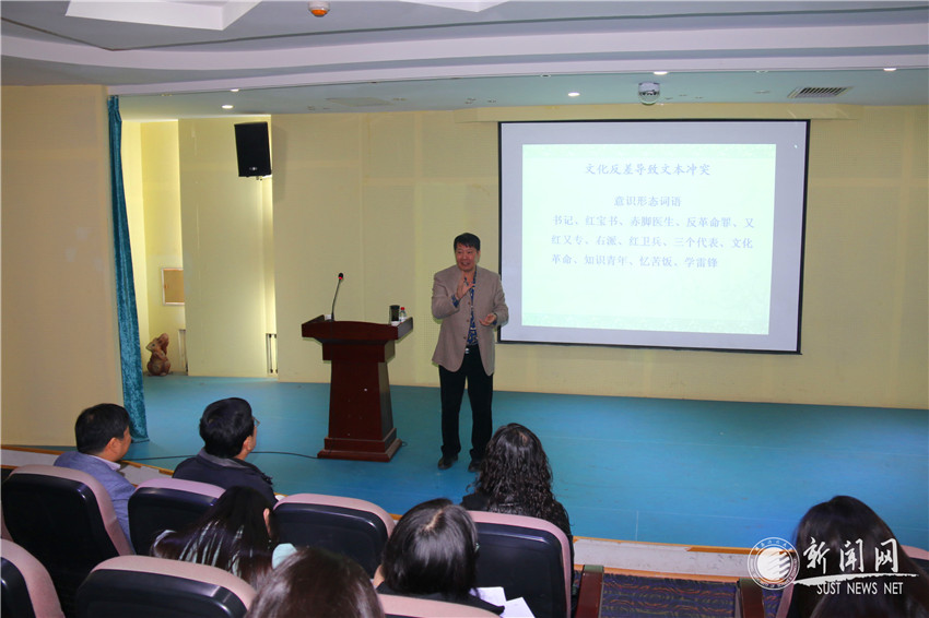 11月15日上午,全國(guó)翻譯專業(yè)學(xué)位研究生教育指導(dǎo)委員會(huì)學(xué)術(shù)委員會(huì)委員、中國(guó)英漢語(yǔ)比較研究會(huì)理事、新疆大學(xué)謝旭升教授應(yīng)邀做客文理學(xué)院導(dǎo)師論壇,并做了題為《文化翻譯多棱鏡—磨合的藝術(shù)》的學(xué)術(shù)報(bào)告。報(bào)告會(huì)由文理學(xué)院院長(zhǎng)藺小林主持,文理學(xué)院外語(yǔ)系教師、翻譯碩士研究生聽取了報(bào)告。