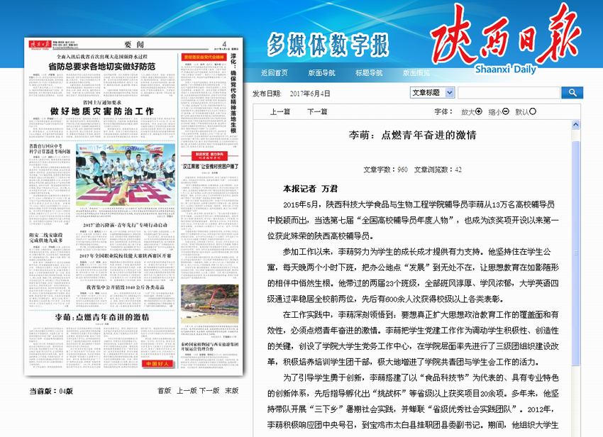 2015年5月,陜西科技大學(xué)食品與生物工程學(xué)院輔導(dǎo)員李萌從13萬名高校輔導(dǎo)員中脫穎而出,當(dāng)選第七屆“全國高校輔導(dǎo)員年度人物”,也成為該獎項開設(shè)以來第一位獲此殊榮的陜西高校輔導(dǎo)員。