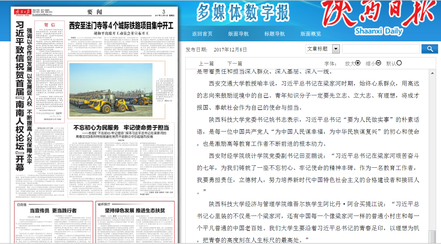 12月8日發(fā)行的《陜西日報》3版要聞刊登了《“探尋習近平總書記在梁家河的青春足印”系列特別報道引起強烈反響》,其中報道我校師生觀文后從中汲取力量、不忘初心、牢記使命勇于擔當?shù)那袑嵏形蚝蜑閷崿F(xiàn)中華民族偉大復興的中國夢和陜西追趕超越貢獻自己力量的踐行意愿,全文轉(zhuǎn)載如下: