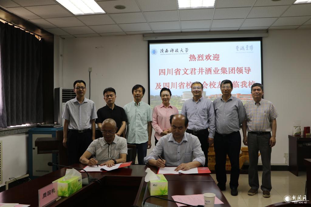 在學校60周年校慶即將來臨之際,四川省文君井酒業(yè)集團有限公司董事長柳先華和總經理黃蜀生(自動化81級校友)及四川校友會秘書長張錦陽(造紙81級校友)一行來我校進行座談交流,副校長李志健出席了座談會,座談會由前沿院常務副院長殷海榮主持??萍继帯⑶把卦?、校友總會、食品生物與工程學院相關負責人參加了座談會。