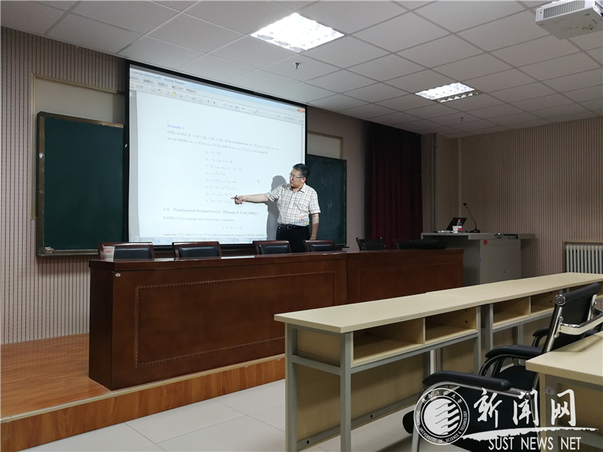 朝魯教授首先以“Differential characteristic set algorithm for PDEs symmetry computation, classification and decision”為題,介紹了吳方法(由我國著名數(shù)學(xué)家、國家最高科技獎獲得者吳文俊先生創(chuàng)立)的基本思想,并系統(tǒng)論述了朝魯教授團(tuán)隊建立的適合計算微分方程對稱的微分形式吳方法及相關(guān)機(jī)械化算法。隨后,以“The R^d representation of symmetry Lie algebra of PDEs and its applications”為題,報告了其團(tuán)隊的最新研究成果,即基于吳方法給出的一種微分方程對稱Lie代數(shù)的R^d表示機(jī)械化算法。報告結(jié)束后,朝魯教授還與師生做了進(jìn)一步交流,并與劉建科教授就兩校文理學(xué)院的緊密合作進(jìn)行了深入探討。