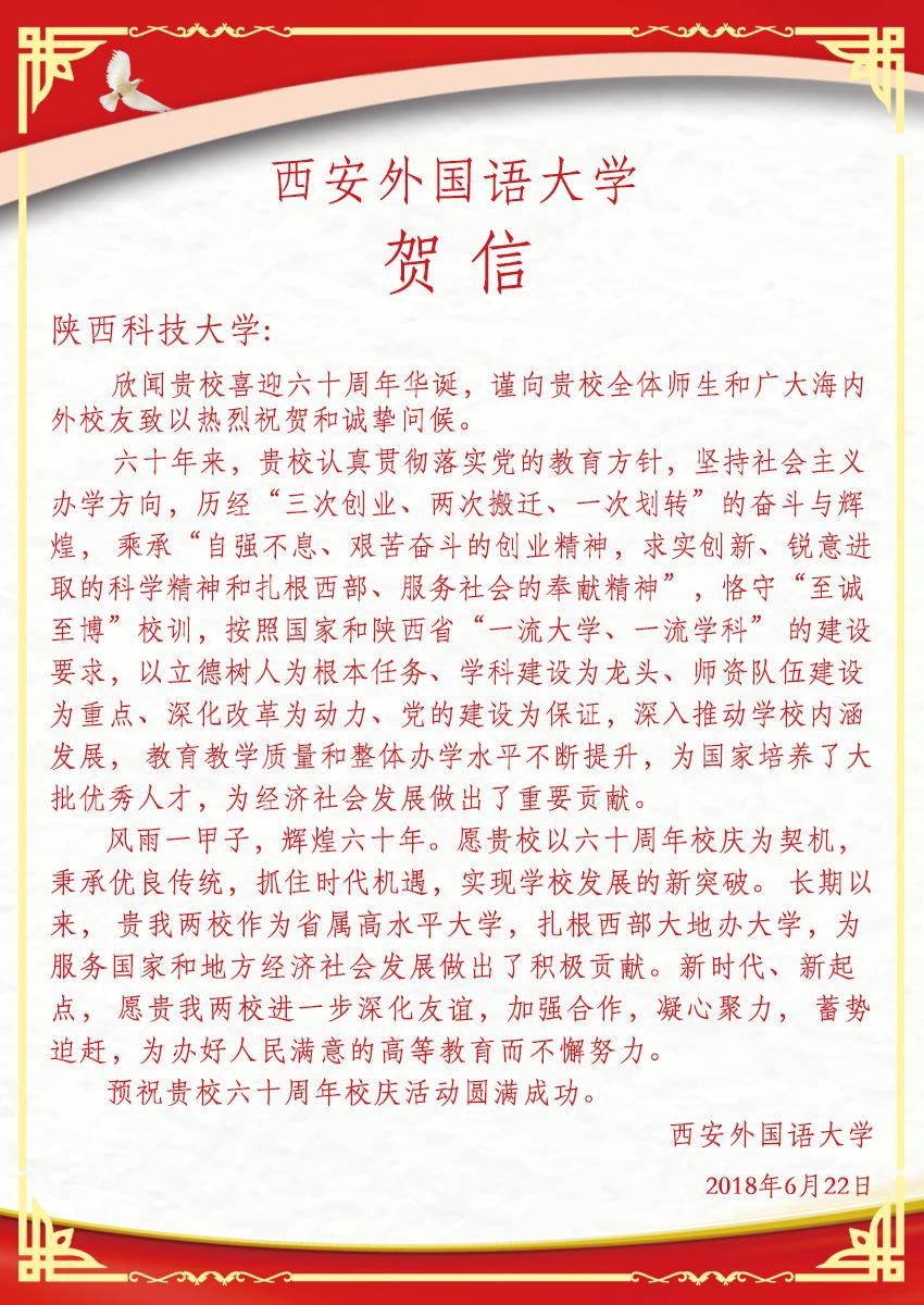 【甲子校慶】西安外國(guó)語(yǔ)大學(xué)賀信