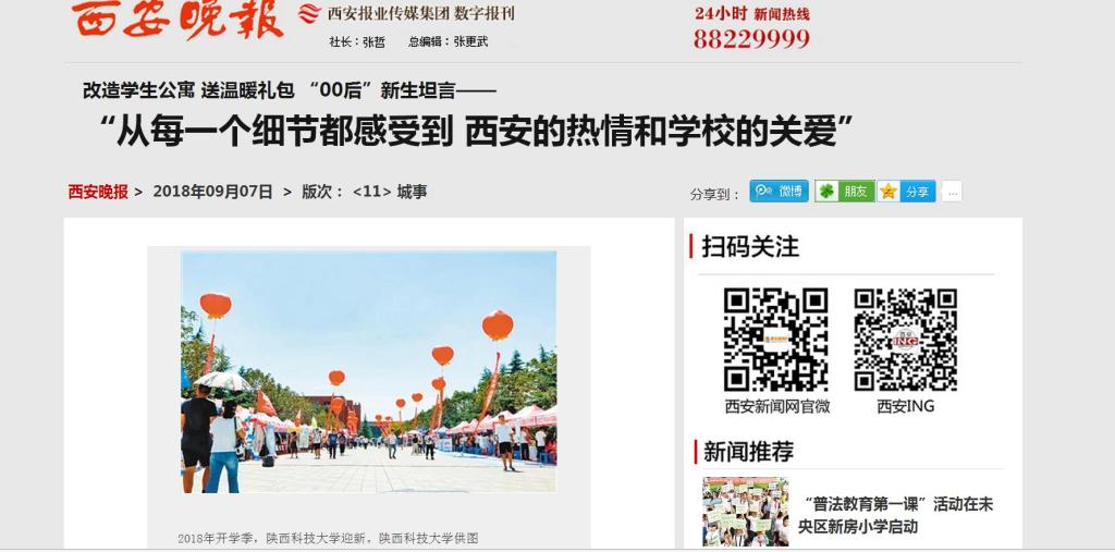 《西安晚報》9月7日以《改造學(xué)生公寓 送溫暖禮包 “00后”新生坦言——“從每一個細節(jié)都感受到 西安的熱情和學(xué)校的關(guān)愛”》為題,報道我校通過改造學(xué)生公寓、準(zhǔn)備“迎新送溫暖禮包”等這些溫暖的方式緩解新生“鄉(xiāng)愁”,鼓勵學(xué)生學(xué)會獨立,盡快適應(yīng)大學(xué)生活。