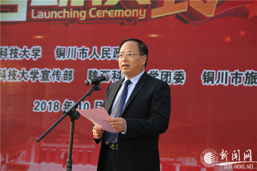 李榮在致辭中介紹了銅川市豐富的自然風(fēng)光和人文景觀、悠久歷史和深厚文化。他指出,2018年是陜甘邊革命根據(jù)地創(chuàng)建85周年,今年8月銅川市被省教育廳授予“青年紅色筑夢之旅實踐基地”稱號,為了更好地發(fā)揮青年學(xué)生思想教育基地作用,在高校弘揚(yáng)照金精神,傳播紅色文化,銅川市舉辦“紅色旅游 五彩銅川”走進(jìn)陜西高校系列活動。陜西科技大學(xué)是與銅川市同齡的新中國第一所輕工高等院校,是陜西省重點(diǎn)建設(shè)的高水平大學(xué),本次活動首站選擇來到陜西科技大學(xué),就是希望借助學(xué)校的良好聲譽(yù)和辦學(xué)影響,通過舉行“紅色旅游”進(jìn)校園活動,增強(qiáng)當(dāng)代青年對紅色旅游的情感認(rèn)同和理性認(rèn)識,讓更多青年成為紅色旅游的參與者、紅色基因的傳承者、紅色精神的踐行者。