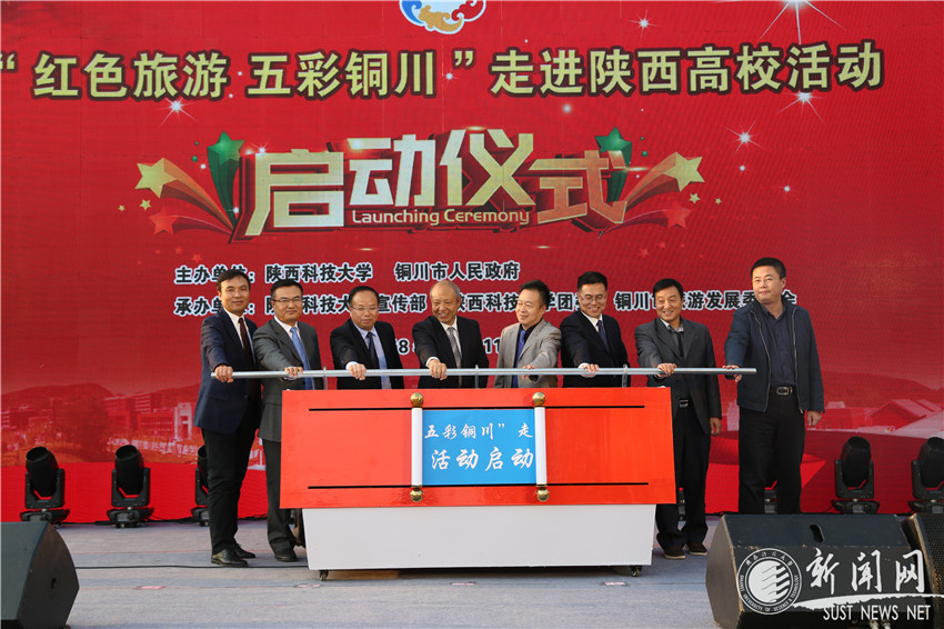 與會領(lǐng)導(dǎo)共同推動活動啟動桿,標(biāo)志著“紅色旅游 五彩銅川”走進(jìn)陜西高?;顒禹樌麊?。