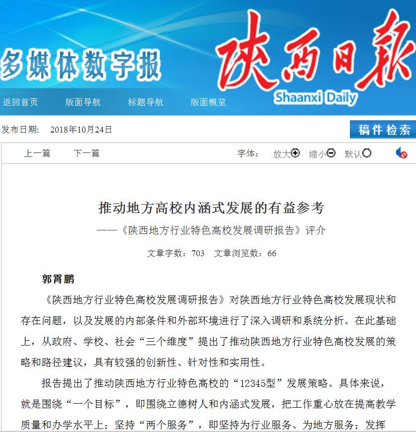 《陜西日報》2018年10月24日“理論專版”刊發(fā)我校郭霄鵬教授團隊獲獎成果評介,題為“推動地方高校內(nèi)涵式發(fā)展的有益參考——《陜西地方行業(yè)特色高校發(fā)展調(diào)研報告》評介”。該成果獲得陜西省第十三次哲學(xué)社會科學(xué)優(yōu)秀成果獎一等獎。