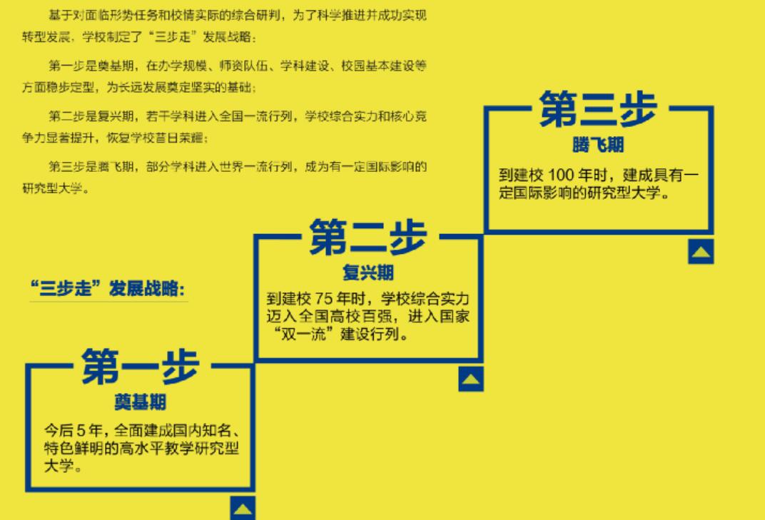 學(xué)校制定了“十三五”事業(yè)發(fā)展規(guī)劃,學(xué)校第二次黨代會提出了奠基、復(fù)興、騰飛的“三步走”發(fā)展戰(zhàn)略,明確了今后五年的主要任務(wù)和發(fā)展舉措,堅(jiān)定不移走好學(xué)科興校、人才強(qiáng)校、質(zhì)量立校之路。