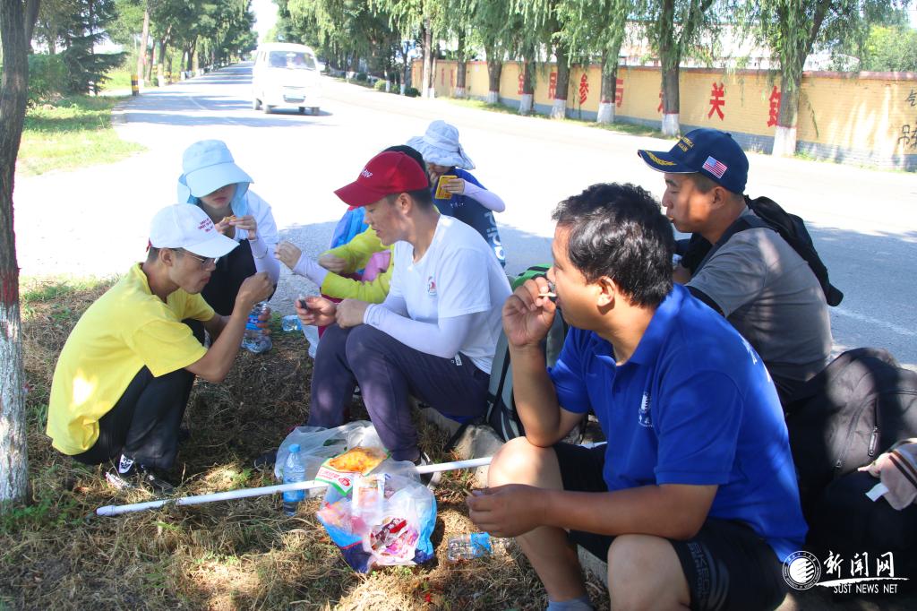 每位隊(duì)員都也無法忘記,他們第一天便經(jīng)歷了嚴(yán)峻考驗(yàn)。2018年7月20日,西安市已進(jìn)入最炎熱的三伏天,體表溫度高達(dá)43度。一行10人舉著隊(duì)旗扛起行囊向北邁進(jìn),熱血方剛正少年,年輕的靈魂以崇高的理想做支柱,歡快的身影在樹蔭下穿梭。然而行走兩個小時,隊(duì)員們便陸續(xù)出現(xiàn)了脫水、中暑的現(xiàn)象。一望無際的關(guān)中大地上的八百里平川,孤零零的一棵草一棵樹,驕陽將大地燙的炙熱,在隊(duì)員們眼中漸漸升騰成虛幻的景象。突然間,隊(duì)伍后面的一個女生倒下了,她的臉漲的通紅,沒有力氣的靠在墻邊坐下來。跟在后面的老師迅速扶起這個女生,隊(duì)員們也七手八腳迅速過來幫忙,拉開防潮墊,喂下藿香正氣水,用滴了風(fēng)油精的濕巾擦拭臉部,補(bǔ)水補(bǔ)鹽補(bǔ)充糖分,拿著大扇子不停扇風(fēng)......有的隊(duì)員自己也已疲憊不堪,但他們還是圍繞在病員旁邊照顧。隊(duì)伍里還有個男生崴了腳,周圍又沒有冰袋,他硬是咬牙堅(jiān)持走到一個村子的小賣鋪里用礦泉水冰鎮(zhèn)腳踝減緩疼痛。汗水濕透了每個人的衣服,又迅速風(fēng)干留下白色的暈記,干燥的風(fēng)里蟬鳴聲顯得越發(fā)擾耳。暮色降臨,空氣的熱度似乎降低了那么一點(diǎn)點(diǎn),大家漸漸適應(yīng)高強(qiáng)度的拉練,加快了行走速度,終于在晚上十一點(diǎn)鐘駐扎在三原縣渠岸鎮(zhèn)初級中學(xué)。