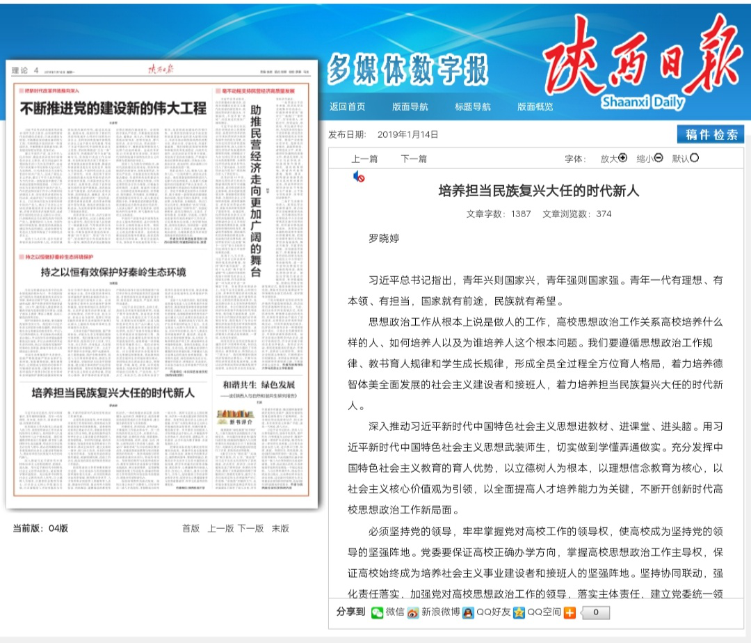 1月14日,《陜西日?qǐng)?bào)》理論版刊發(fā)我校學(xué)生就業(yè)指導(dǎo)中心羅曉婷的署名文章《培養(yǎng)擔(dān)當(dāng)民族復(fù)興大任的時(shí)代新人》,全文轉(zhuǎn)載如下: