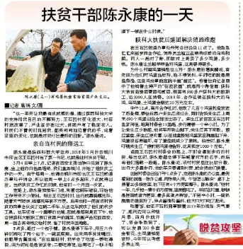 3月7日,《西安日報(bào)》報(bào)道我校扶貧干部陳永康先進(jìn)事跡《扶貧干部陳永康的一天》,全文如下: