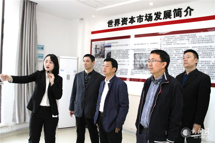 副校長(zhǎng)黃劍鋒(右二)、中國(guó)證監(jiān)會(huì)陜西監(jiān)管局投保處處長(zhǎng)王明生等參觀經(jīng)管學(xué)院