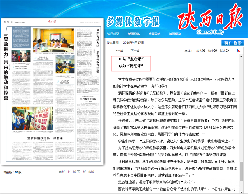 2019年4月17日,《陜西日?qǐng)?bào)》教育版以《“思政魅力”帶來(lái)的觸動(dòng)和驚喜》為題,報(bào)道全省思政課改革創(chuàng)新成果。文中,從“點(diǎn)名課”成為“網(wǎng)紅課”部分報(bào)道了我校思政課堂教學(xué)改革創(chuàng)新的成效。