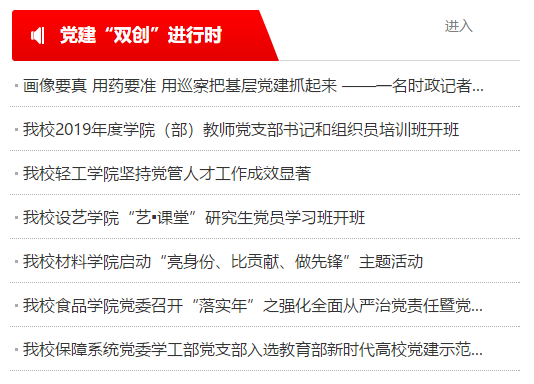 為深入引領(lǐng)推動(dòng)學(xué)校黨建工作質(zhì)量整體提升,近日,宣傳部在校園網(wǎng)主頁(yè)精心增設(shè)了新時(shí)代高校黨建“雙創(chuàng)”工作專題網(wǎng)站,為全校各級(jí)黨支部、師生黨員提供“雙創(chuàng)”時(shí)政熱點(diǎn)研讀、全國(guó)示范性黨支部建設(shè)新成果等各類(lèi)理論學(xué)習(xí)、經(jīng)驗(yàn)借鑒、思想交流的平臺(tái)。