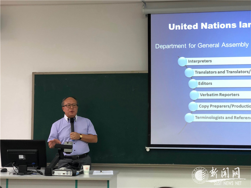 李正仁教授首先介紹了聯(lián)合國語言類工作人員的類別、崗位要求、崗位職責(zé)以及翻譯人員應(yīng)該具備的基本職業(yè)道德。隨后,就翻譯能力提升問題,李教授列舉了真實(shí)具體的翻譯案例,通過對比不同版本的譯文,李教授強(qiáng)調(diào)了準(zhǔn)確用詞的重要性,指出合格譯員應(yīng)具備辨別詞語間細(xì)微差別的能力。無論是英譯中,還是中譯英,譯員都要在理解原語的前提下,結(jié)合具體語境,準(zhǔn)確地傳達(dá)原語信息及立場。此外,李教授還分享了聯(lián)合國網(wǎng)站的翻譯培訓(xùn)材料,申請聯(lián)合國實(shí)習(xí)崗位的渠道等信息,鼓勵(lì)大家申請聯(lián)合國實(shí)習(xí)項(xiàng)目,體驗(yàn)國際組織的工作環(huán)境,培養(yǎng)國際視野,充實(shí)人生經(jīng)歷。