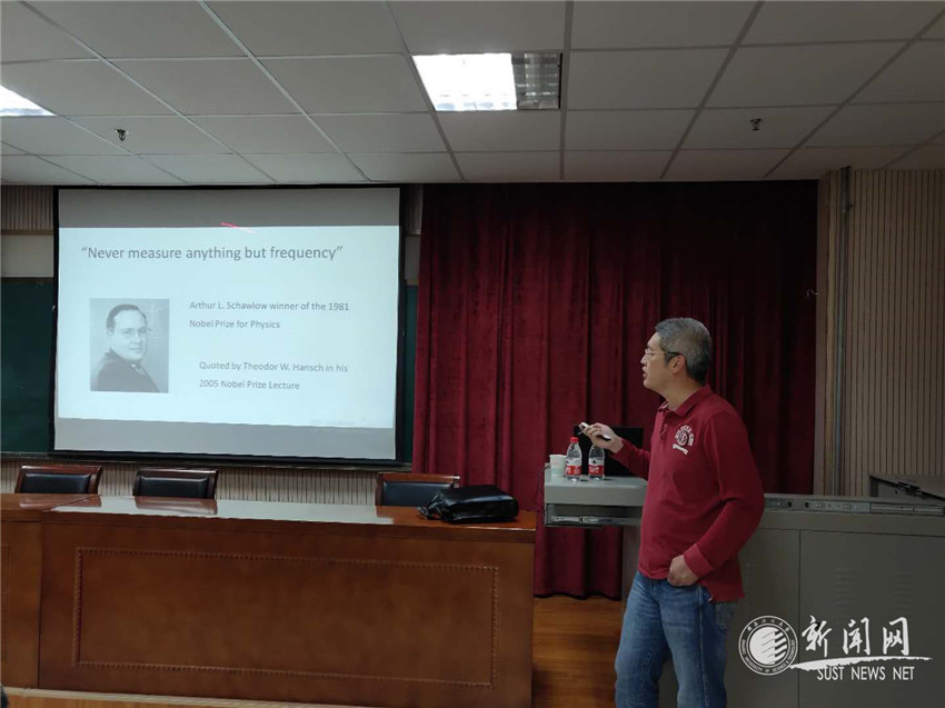 姜海峰教授首先從經(jīng)典物理學(xué)牛頓時間概念出發(fā),以時間頻率技術(shù)的基礎(chǔ)性、廣泛性和前沿性基礎(chǔ),通過對飛秒光頻梳研究領(lǐng)域諾貝爾物理學(xué)獎的梳理,對飛秒光頻梳技術(shù)的特點、分類以及研究現(xiàn)狀等進(jìn)行了詳細(xì)報告。他還以課題組近十年在飛秒激光光頻梳領(lǐng)域的取得的研究成果為主線,進(jìn)一步報告了飛秒光頻梳的發(fā)展趨勢及其他們課題組在該領(lǐng)域的研究貢獻(xiàn)。姜海峰研究員的報告既有物理基礎(chǔ),又有理論背景和學(xué)科前沿成果報告,使在座聽眾對飛秒光頻梳技術(shù)的重要性有了新認(rèn)識,并產(chǎn)生了濃厚的興趣。