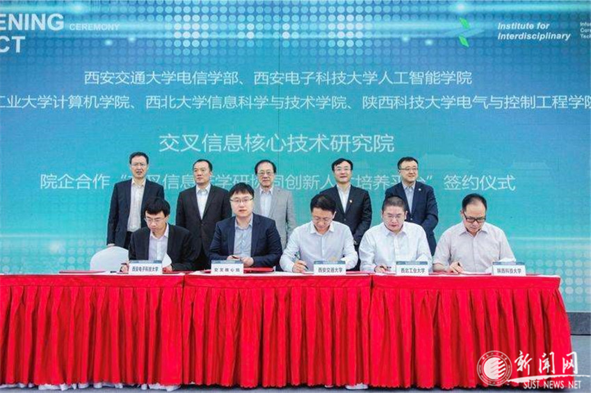 投運(yùn)慶典儀式上,在姚期智、鐘洪江、王勇、楊斌、李志軍的共同見證下,交叉核心院與陜西科技大學(xué)電氣與控制工程學(xué)院、西安交通大學(xué)電信學(xué)部、西安電子科技大學(xué)人工智能學(xué)院、西北工業(yè)大學(xué)計(jì)算機(jī)學(xué)院、西北大學(xué)信息科學(xué)與技術(shù)學(xué)院等5所培養(yǎng)單位以及中國銀行業(yè)協(xié)會(huì)、德邦證券股份有限公司、西安深信科創(chuàng)信息技術(shù)有限公司、新石器交叉信息核心技術(shù)研究院(西安)等4家企業(yè)簽約,合作建立“交叉信息產(chǎn)學(xué)研協(xié)同創(chuàng)新人才培養(yǎng)平臺(tái)”。湯偉代表我校電控學(xué)院上臺(tái)簽約并領(lǐng)牌。