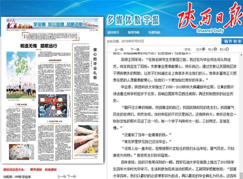 7月3日,《陜西日?qǐng)?bào)》畢業(yè)季專(zhuān)版以《相逢無(wú)悔 踏歌遠(yuǎn)行》為題,報(bào)道全省各高校2019畢業(yè)季的青春故事。文中,“大學(xué)的日子像一本書(shū)”部分報(bào)道了我校畢業(yè)季推出的1958—2019陜科大典藏版畢業(yè)照。