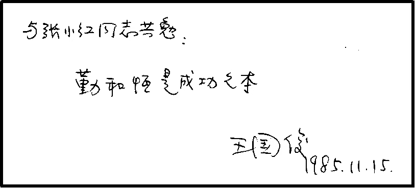 和年輕學(xué)子一樣,我年輕時也會追星,我崇拜的明星很少,不過卻堅持了幾十年。這里,也分享給大家一位我崇拜的明星。讀大學(xué)時,我校多次邀請當(dāng)時擔(dān)任陜西師范大學(xué)校長的王國俊教授來作學(xué)術(shù)報告,他曾經(jīng)在我的家鄉(xiāng)做過中學(xué)老師,不僅數(shù)學(xué)研究很深入、成果豐富,課也講得很漂亮,我被他的魅力深深吸引,聽他講數(shù)學(xué)就是一種享受。畢業(yè)留校那年,我校再次邀請王國俊教授來作報告,我很榮幸參與接待他。在學(xué)術(shù)交流間隙,我?guī)е鴦偰玫讲痪玫氖讉€教師節(jié)紀(jì)念冊,找他簽名,并希望他給予指點(diǎn)。王老師把他的座右銘寫了下來贈予我,這也成為我日后幾十年激勵自己不懈努力的座右銘。