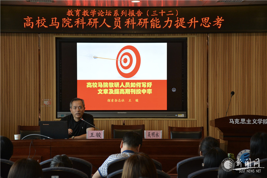 王駿教授以“我們經(jīng)常會(huì)遇到的投稿被拒的原因”分析展開(kāi)報(bào)告,針對(duì)馬院師生如何提高論文寫(xiě)作水平和發(fā)表機(jī)率提出了寶貴的建議。王教授從期刊論文撰寫(xiě)前的準(zhǔn)備、開(kāi)題、撰寫(xiě)、投稿等四個(gè)方面詳細(xì)介紹了期刊論文創(chuàng)作發(fā)表的一般要求,尤其強(qiáng)調(diào)選題是研究的起點(diǎn)與方向,應(yīng)堅(jiān)持創(chuàng)新性、現(xiàn)實(shí)性和前瞻性三個(gè)原則的統(tǒng)一。他論述了期刊編輯對(duì)來(lái)稿的三點(diǎn)期待,即創(chuàng)新、精致、氣韻,強(qiáng)調(diào)文章有無(wú)創(chuàng)新是論文能否被錄用的關(guān)鍵。并結(jié)合自身的工作經(jīng)驗(yàn),認(rèn)真分析了《探索》雜志社的用稿特點(diǎn)。