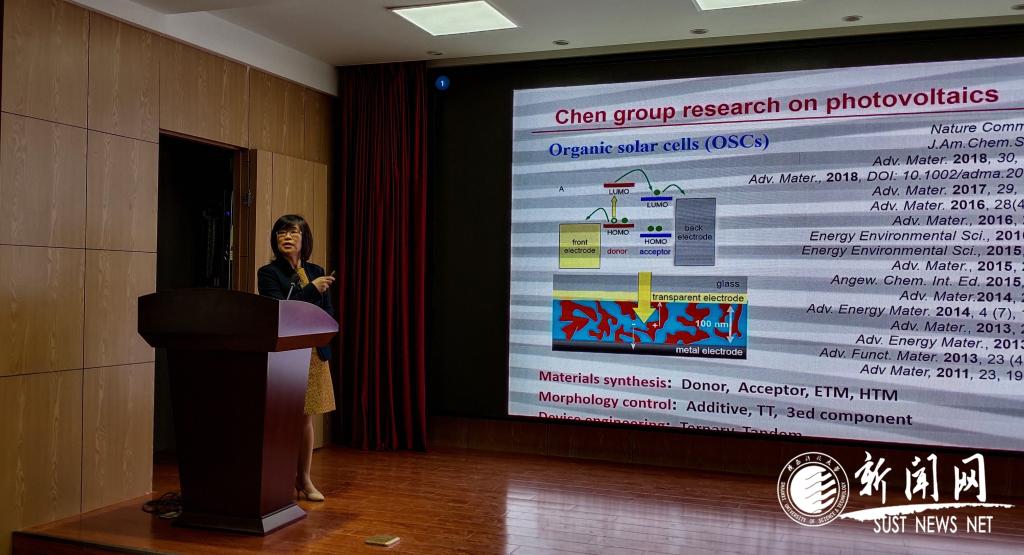 陳紅征教授報(bào)告的題目是“高效低成本有機(jī)太陽電池材料與器件”,她闡述了發(fā)展有機(jī)太陽能電池的重要意義,指出影響太陽能電池轉(zhuǎn)化效率的因素。主要針對傳統(tǒng)的通過稠合方式合成有機(jī)太陽電池材料存在合成工藝復(fù)雜、成本高的問題,提出非稠合法合成有機(jī)太陽能電池材料的新方法,此方法具有合成過程簡單,高效率、低成本的優(yōu)點(diǎn)。而且,非稠合分子基于碳-氫-氧弱相互作用的構(gòu)象為優(yōu)勢構(gòu)象,分子骨架在溶液中易扭轉(zhuǎn),具有良好的溶液加工性和優(yōu)異的薄膜光電特性,在有機(jī)太陽能電池材料與器件的制備過程中具有很高的應(yīng)用價(jià)值。陳教授還就師生們有關(guān)鈣鈦礦太陽能電池、導(dǎo)電高分子材料等存在的問題進(jìn)行了細(xì)致解答。