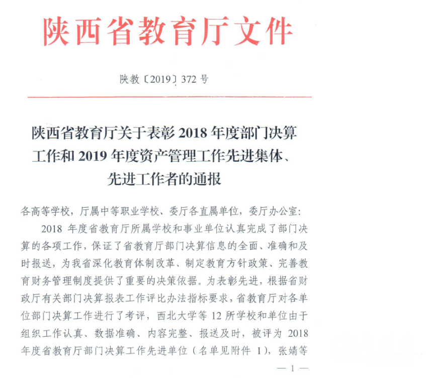 12月23日,陜西省教育廳下發(fā)《關于表彰2018年度部門決算工作和2019年度資產(chǎn)管理工作先進集體、先進工作者的通報》(陜教[2019]372號)文件,我校榮獲2019年度教育行政事業(yè)單位國有資產(chǎn)管理先進集體。這是我校連續(xù)6年獲此榮譽。
