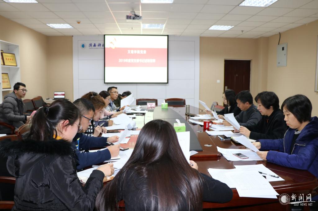 為進(jìn)一步學(xué)習(xí)貫徹習(xí)近平新時(shí)代中國(guó)特色社會(huì)主義思想和黨的十九大精神,落實(shí)全面從嚴(yán)治黨主體責(zé)任,扎實(shí)推進(jìn)黨支部建設(shè),1月6日下午文理學(xué)院黨委召開2019年度黨支部書記述職答辯會(huì),學(xué)院黨委班子成員、系主任及全體支部書記參加,會(huì)議由院黨委委員彭丹主持。