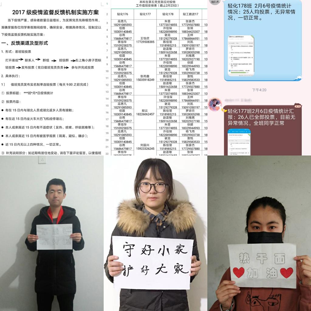 輕工學院本科生第五黨支部構建3+3聯防模式,服務2017級全體本科生疫情防控工作。制定《2017級學生疫情監(jiān)督反饋實施方案》,構建班級、黨支部、輔導員三線聯防,通過每日每班一黨員值班的模式,有效借助易班、QQ等平臺開展疫情信息統(tǒng)計反饋和防控宣傳工作,發(fā)現同學有身體不適的情況,及時取得聯系并上報。同時支部內部形成三層監(jiān)督反饋職責,黨員輪值負責、積極分子帶頭完成、團員群眾有效履責,相互監(jiān)督,確保了年級防疫工作有序推進。