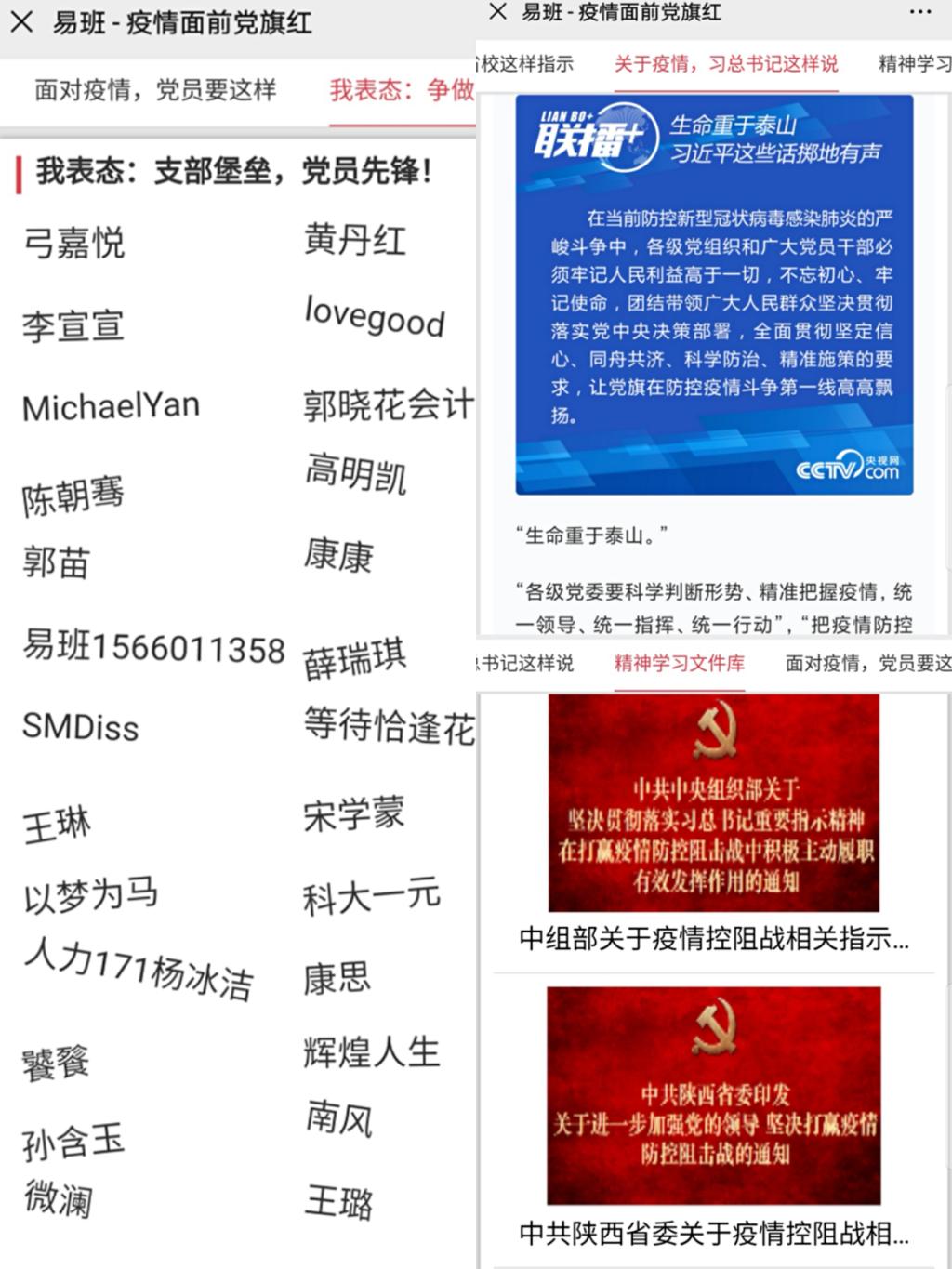 三是創(chuàng)新形式,做好引領。主動開展“疫情面前黨旗紅”特殊黨日活動,通過易班搭建輕應用快搭,為經管學院全體黨員、積極分子提供黨中央抗擊疫情相關指示、習近平總書記講話等內容,引導黨員配合各級各部門防疫工作,充分發(fā)揮一個支部一個堡壘的戰(zhàn)斗作用,倡議全體黨員勇面疫情,爭做先鋒。