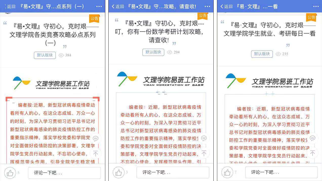 在政策宣傳方面,教育學院黨務工作中心帶領全體黨員積極籌劃、群策群力,對學院學生黨建官微后臺進行改版,新增了疫情動態(tài)(實時狀況、疫情解疑、直擊現(xiàn)場)、辟謠科普(辟謠科普、個人防護)及馳援武漢(我為武漢加油)欄目,宣傳黨的政策方針。在學業(yè)幫扶方面,成立了教育學院學業(yè)幫扶黨員工作小組,學生黨員對全院學生掛科情況進行了摸排,并對接班委對學生學習狀況進行分析,以難點科目以及掛科數(shù)目多的學生為重點,制定詳實可行的輔導計劃,共享學習資料并及時進行線上答疑,在學業(yè)上進行精準幫扶。