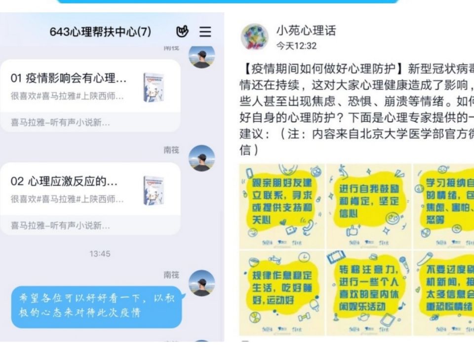 針對疫情防控期間可能會出現(xiàn)的學生心理困擾,學生黨支部協(xié)同學院心理協(xié)會成立心理幫扶小組,將設崗定責人員、宿舍長、班級心理委員等學生干部聯(lián)結起來,積極了解學生群體的心理健康狀況,以宿舍為單位開展線上心理幫扶、政策宣講等工作,同時建立“小苑心里話”官Q(mào)互動平臺,在這個特殊時期,努做好學生群體的情緒疏導,幫助他們做好心理防“疫”!