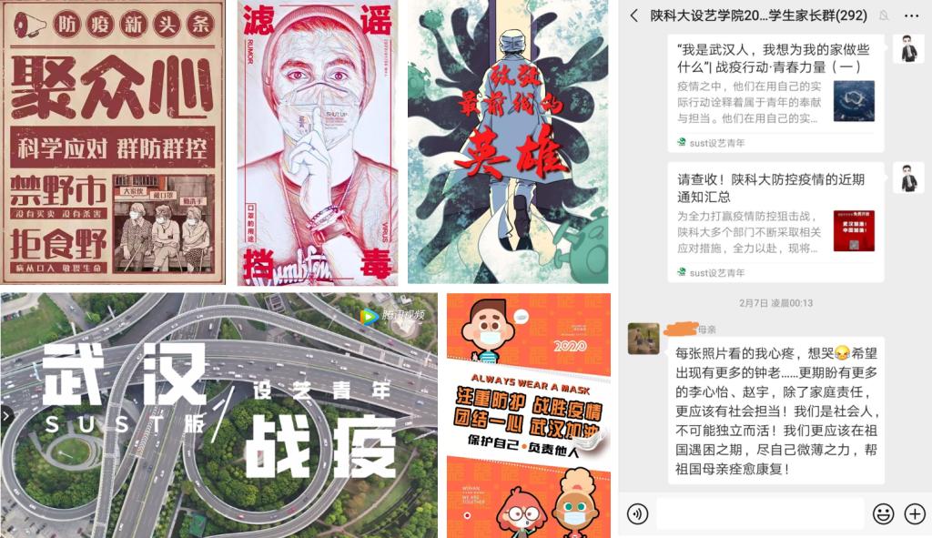 宣傳教育,關(guān)愛防疫。學(xué)院領(lǐng)導(dǎo)工作小組每日通過微信、學(xué)習(xí)強(qiáng)國(guó)等app及時(shí)宣傳市區(qū)及學(xué)校防疫工作進(jìn)展、防疫知識(shí),組織教研室主任、輔導(dǎo)員主動(dòng)聯(lián)系校外師生,尤其是湖北武漢籍師生,了解師生狀況,堅(jiān)定抗疫信心。疫情發(fā)生以來,指導(dǎo)“sust設(shè)藝青年”等公眾號(hào)推送相關(guān)文章45篇,宣傳防疫工作、防疫知識(shí),防止造謠傳謠,從思想上充分調(diào)動(dòng)師生重視疫情。指導(dǎo)學(xué)院團(tuán)委宣傳報(bào)道防疫阻擊戰(zhàn)中的青年事跡,收獲學(xué)生家長(zhǎng)的高度肯定和贊賞,牢固樹立“非常時(shí)期,在家也是作貢獻(xiàn)”的意識(shí)觀念。發(fā)起“新冠肺炎疫情防控”主題海報(bào)征集活動(dòng),從各黨支部、團(tuán)支部收集作品91幅,并精選40幅進(jìn)行推送,內(nèi)容包含防疫知識(shí)宣傳、致敬英雄、加油鼓勁等,該推文總瀏覽量超過3000+,并獲得陜西省網(wǎng)絡(luò)思政中心轉(zhuǎn)發(fā)報(bào)道。編導(dǎo)學(xué)生黨支部組織黨員、團(tuán)員共同創(chuàng)作視頻《武漢戰(zhàn)疫·陜科大特別版》,瀏覽量12000+,視頻以青年視角致敬了奮戰(zhàn)在疫情一線的工作人員,凝聚起師生共克時(shí)艱的信心。