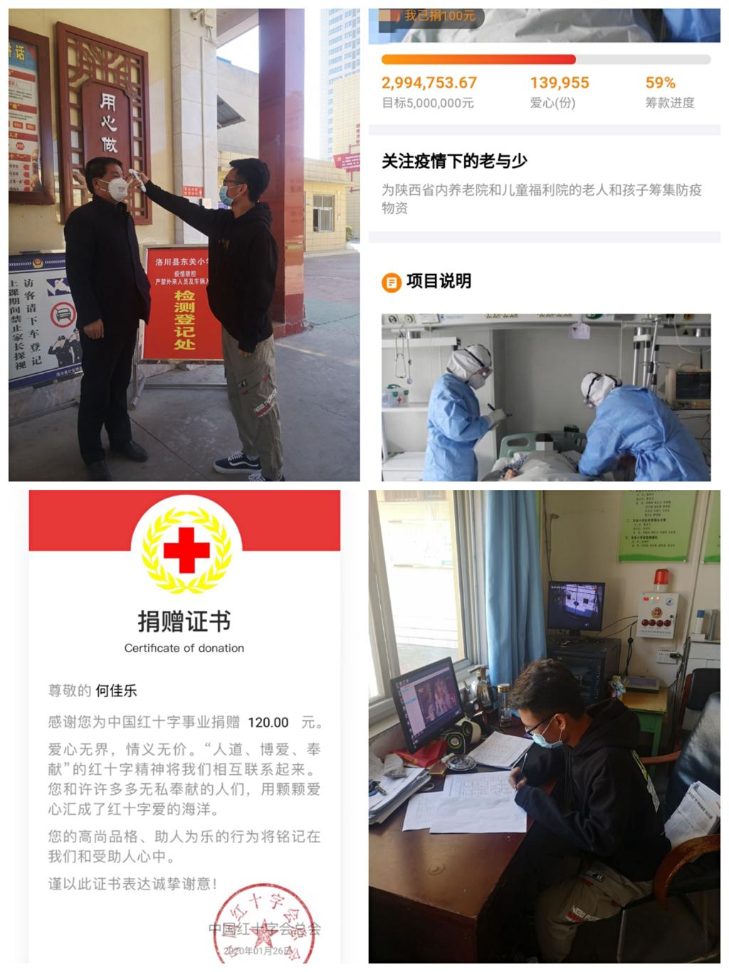 學(xué)生第三黨支部黨員杜丹陽同志在疫情防控工作中主動(dòng)擔(dān)當(dāng),身先士卒。作為一名學(xué)生黨員,杜丹陽同志在家鄉(xiāng)疫情防控工作中主動(dòng)請(qǐng)纓,參與寶雞市鳳翔縣虢王鎮(zhèn)劉淡村村委會(huì)組織的黨員服務(wù)活動(dòng),在劉淡村南路口卡點(diǎn)處協(xié)助登記進(jìn)出入車輛及人員,協(xié)助村干部開展防疫宣傳;作為一名學(xué)生干部,他積極踐行志愿服務(wù),積極幫助班級(jí)同學(xué),建立并參與四六級(jí)打卡群,進(jìn)行考研知識(shí)分享,同時(shí)通過“支付寶”平臺(tái)給陜西省內(nèi)養(yǎng)老院和兒童福利院的老人和孩子籌集防疫物資并進(jìn)行捐款,用自身行動(dòng)詮釋了共產(chǎn)黨員的責(zé)任與擔(dān)當(dāng)。