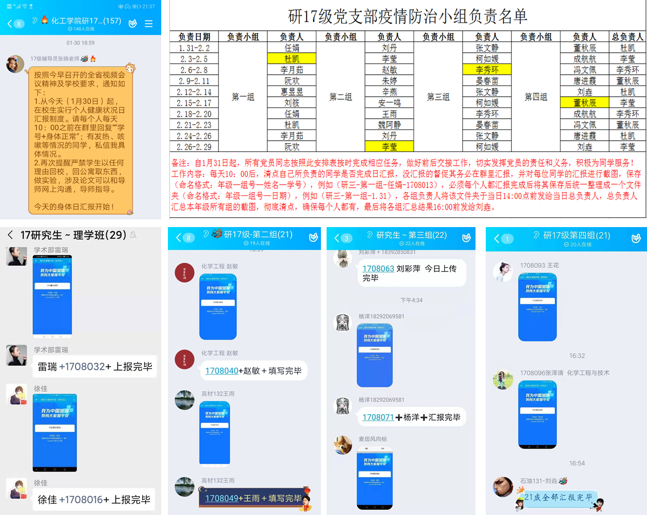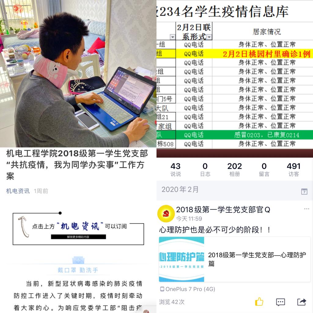 2月7日以來,機電學(xué)院輔導(dǎo)員王正宏組織支部黨員構(gòu)建1+6戰(zhàn)“疫”模式,通過網(wǎng)絡(luò)發(fā)起1場“共抗疫情,我為同學(xué)辦實事”主題黨日活動,支部對口的30名入黨積極分子加入,迅速組建成6個工作組,全員行動助力疫情防控,服務(wù)同學(xué)。信息組構(gòu)建年級網(wǎng)格化管理矩陣,每日協(xié)助輔導(dǎo)員了解學(xué)生信息、居家困惑及心理、學(xué)業(yè)需求;科普組累計發(fā)布疫情信息、防護知識43條;宅家攻略組發(fā)布居家健身、心理防護知識3期;學(xué)業(yè)幫扶組根據(jù)47名同學(xué)學(xué)業(yè)幫扶需求,每日開展線上答疑、打卡活動;學(xué)生返校工作籌備組提前建立專業(yè)學(xué)生返校工作方案,為學(xué)院學(xué)生返校健康篩查、入住宿舍、學(xué)習(xí)生活做好準備。